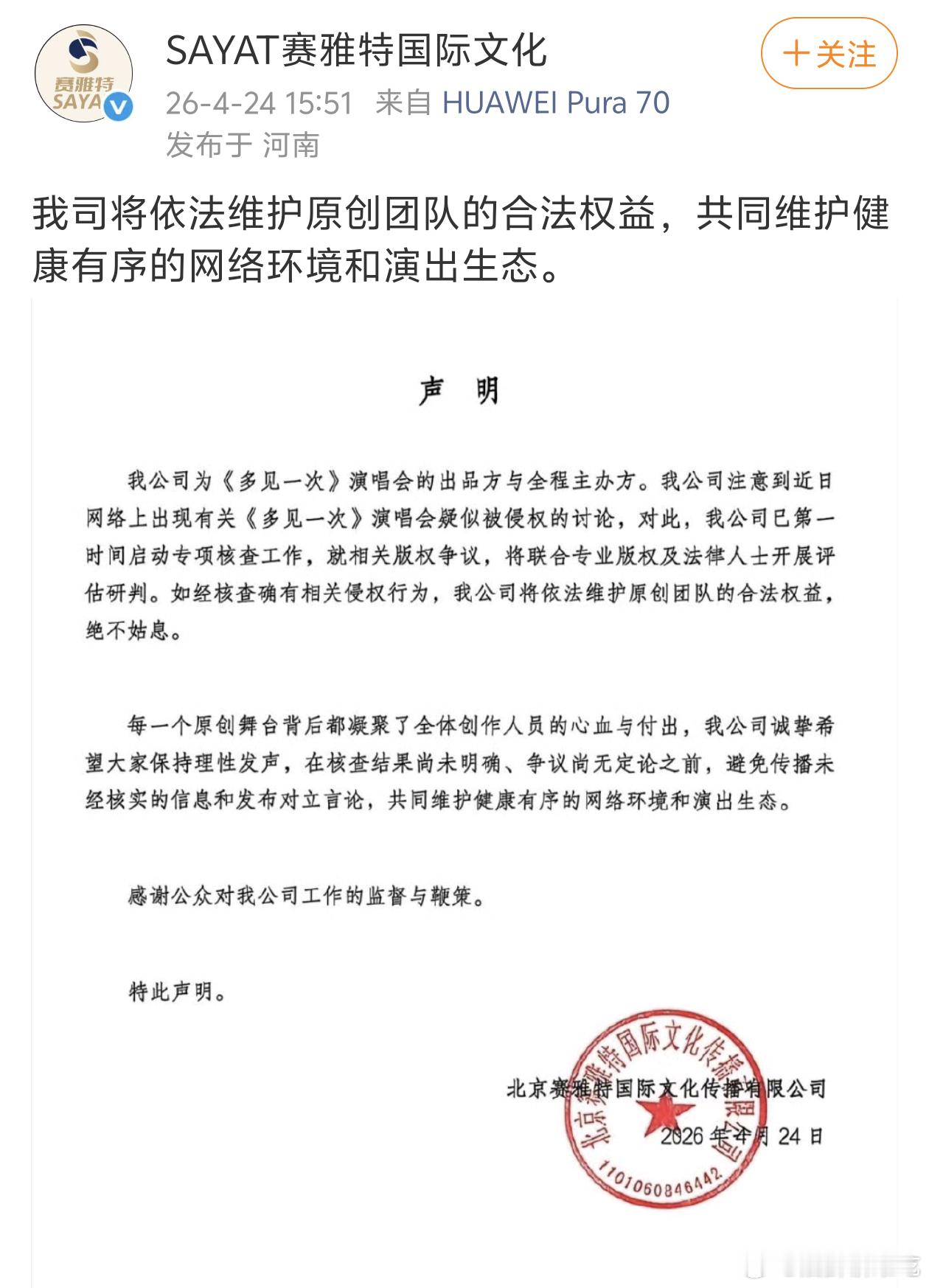檀健次演唱会出品方发布声明, 将依法维护原创合法权益