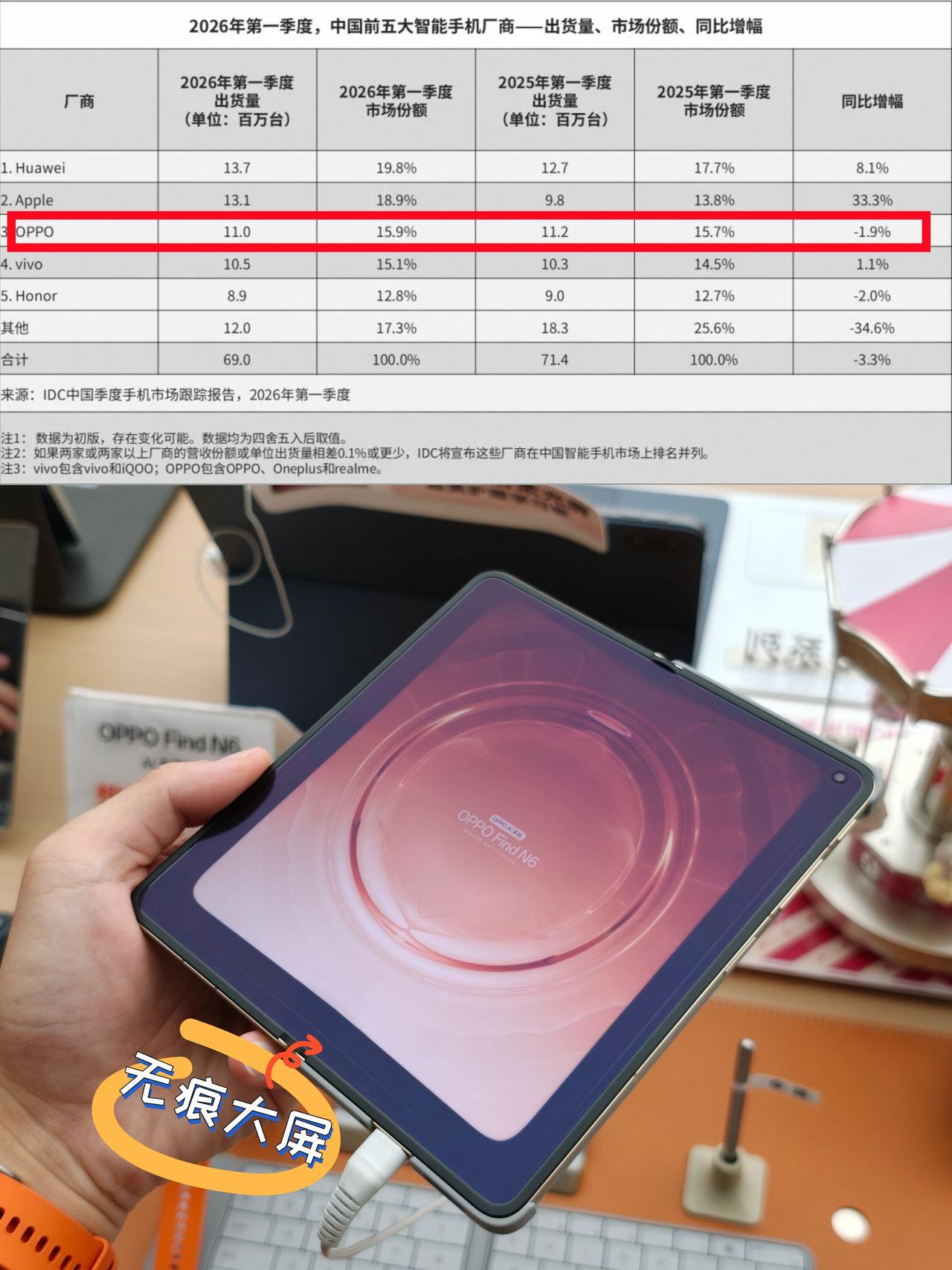 刚刷到IDC发布的2026年一季度国内手机出货量报告
