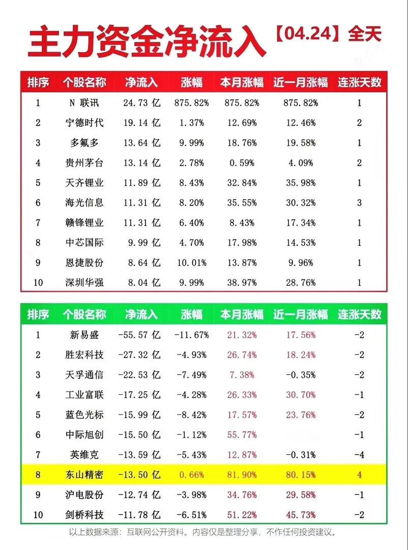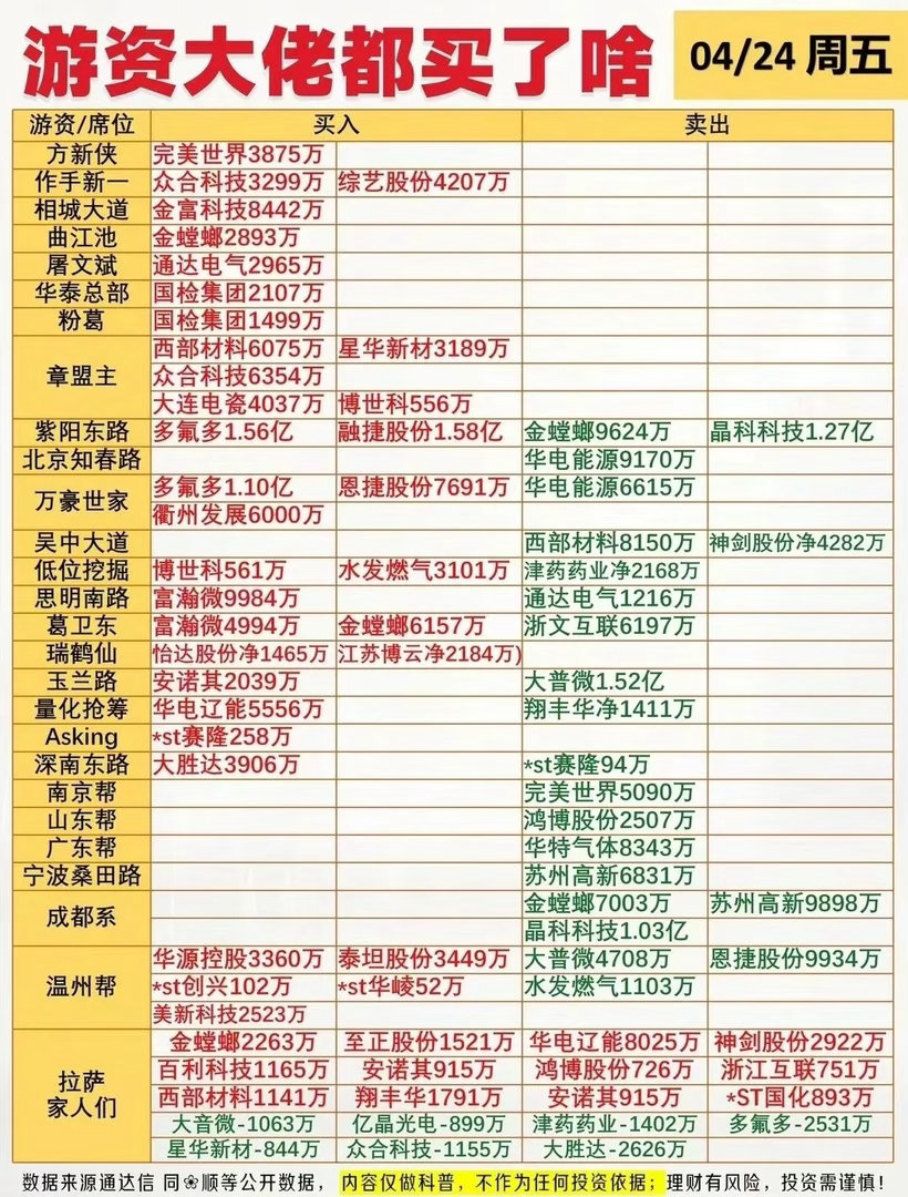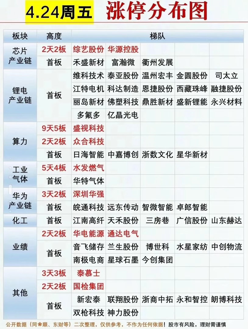 04.24 周五市场复盘24日指数整体震荡偏弱,沪指微跌0.33%,创业板指跌超1%,两市成交额26580亿,较昨日缩量1656亿,主力资金净流出超574亿,赚钱效应不足,超3300家个股飘绿。锂电产业链成为市场最强主线,多氟多、恩捷股份等多股涨停,天齐锂业、天华新能领涨板块,锂矿、电解液、电池材料集体爆发;算力方向分化,盛视科技走出9天5板,成为全场高标,众合科技2连板晋级,低位首板零星分布;工业气体、燃气轮机电、一季报超预期个股也有亮眼表现,泰慕士、水发燃气连板晋级。游资方面,章盟主、紫阳东路、万豪世家纷纷大手笔做多锂电龙头多氟多,拉萨军团则在多只高位股中做T博弈,资金分歧加剧。市场主线聚焦锂电复苏,AI算力进入分化阶段,资金高低切换明显,下周重点关注锂电板块持续性与高标接力情绪。