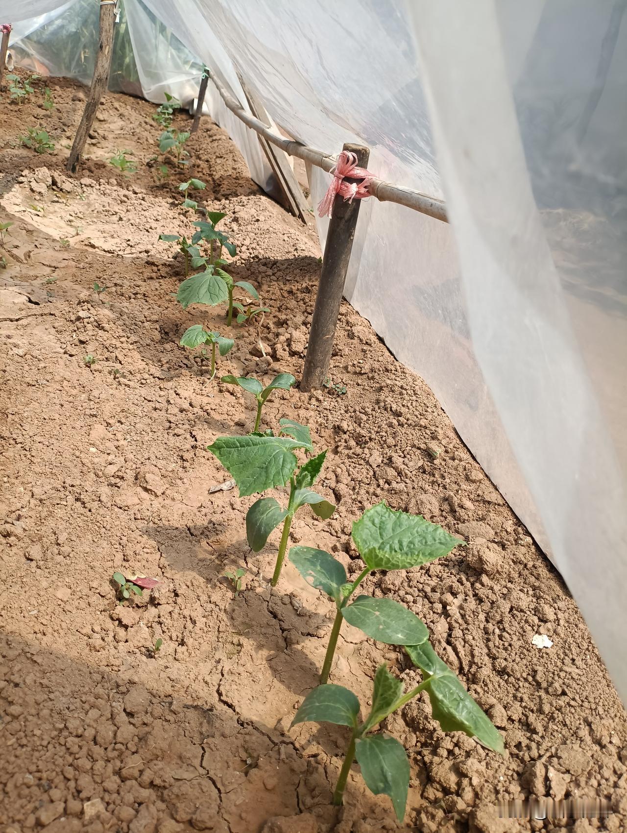 就地取材,用竹竿搭架子,再蒙上塑料纸搭个简易小暖棚,保温又保湿,育苗效果特别好。靠着这个小暖棚提前育苗移栽,黄瓜能早早缓苗生长。