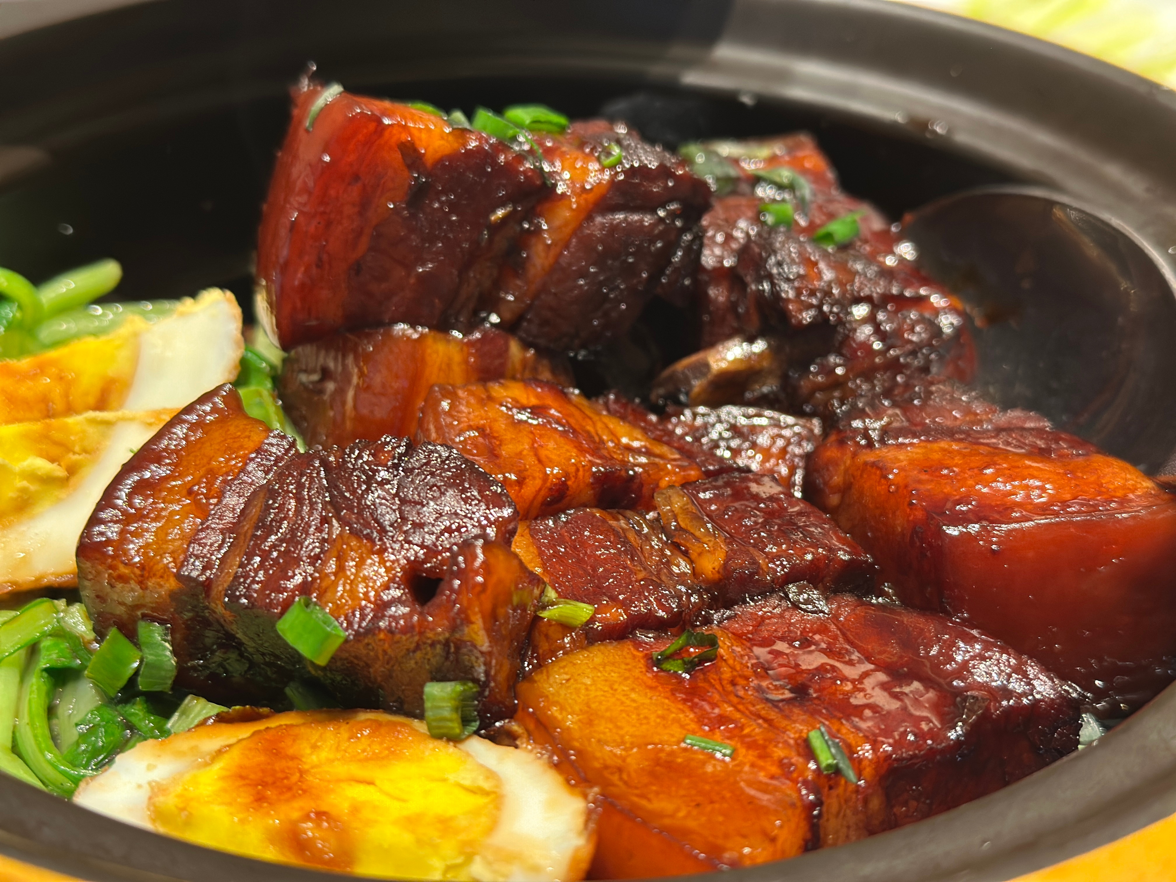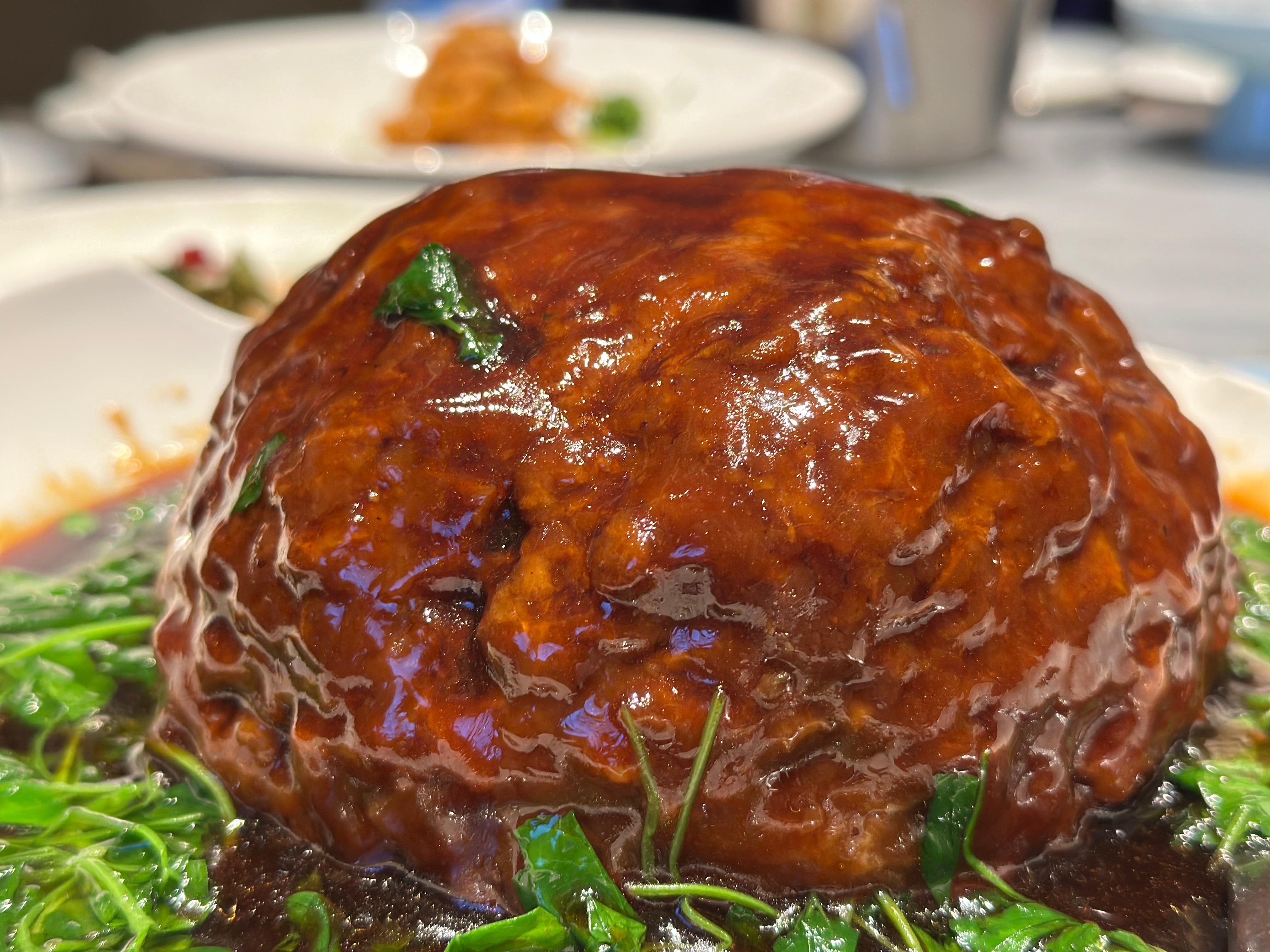 他超级喜欢馄饨,切了一大块狮子头,也是整张桌子唯一吃了两大块红烧肉的人。