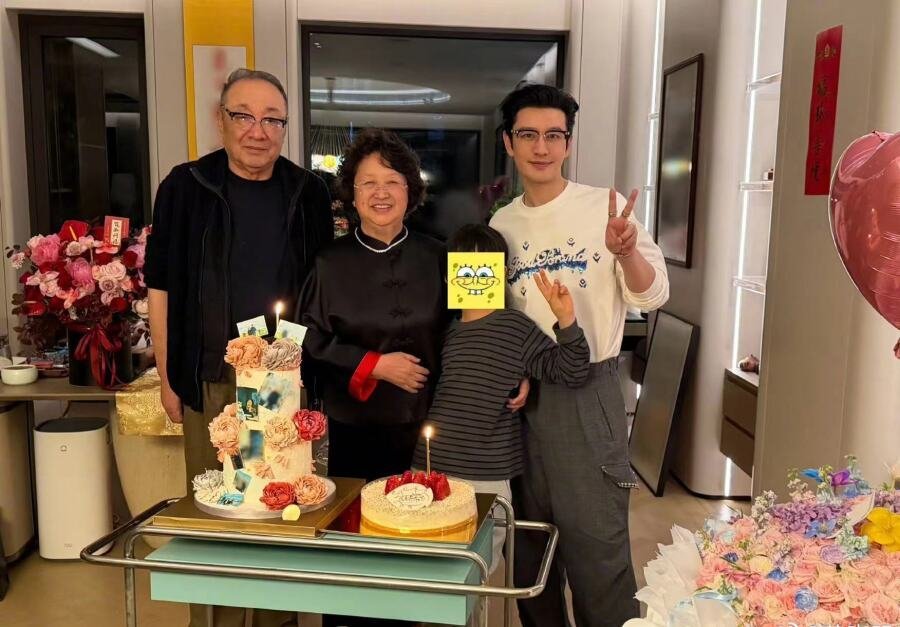 黄晓明一家四口在上海团聚,9岁儿子小海绵回到爸爸家里,一起为奶奶庆祝74岁生日。