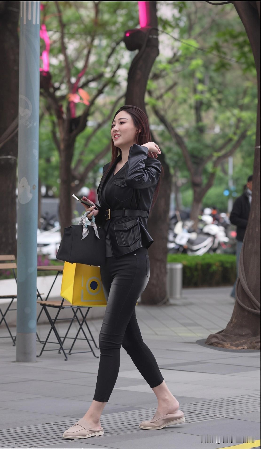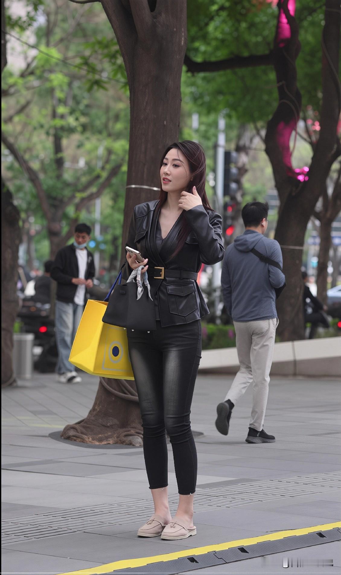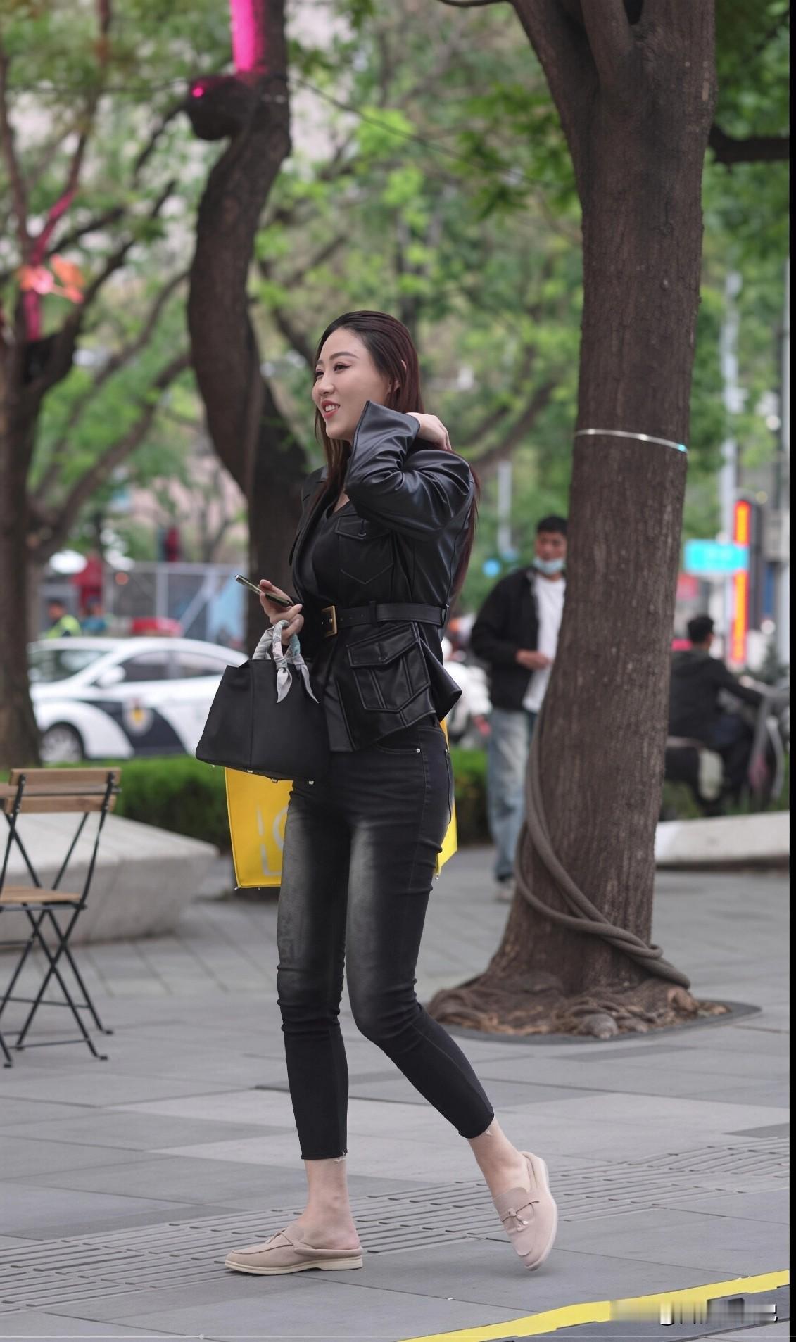 黑皮衣+九分牛仔裤,梨形穿不显胖