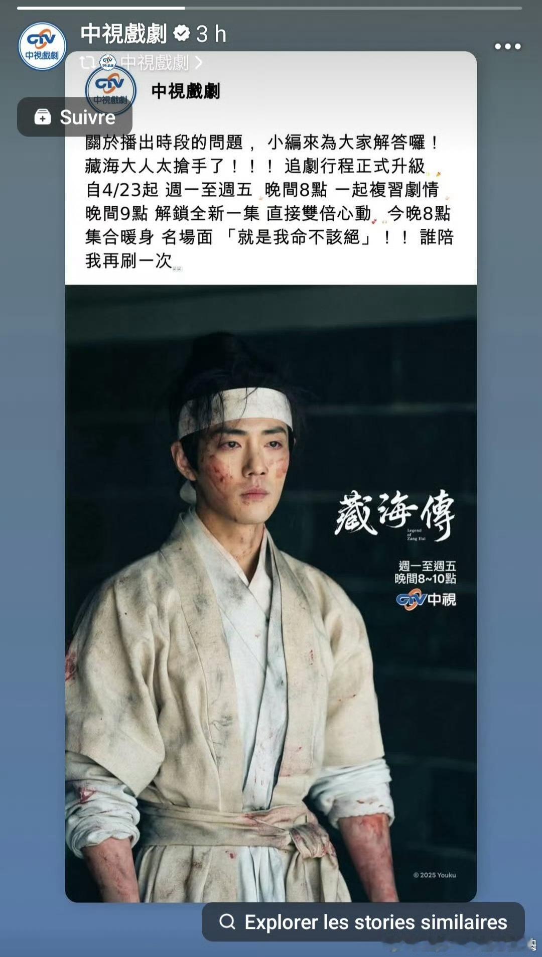 中视IG分享肖战藏海传追剧日行程,由于藏海传太过火爆,自4月23日起,晚8点重播一集,晚9点更新一集!好奇特的播剧方式剧王就这样时隔一年开播仍是爆款👏