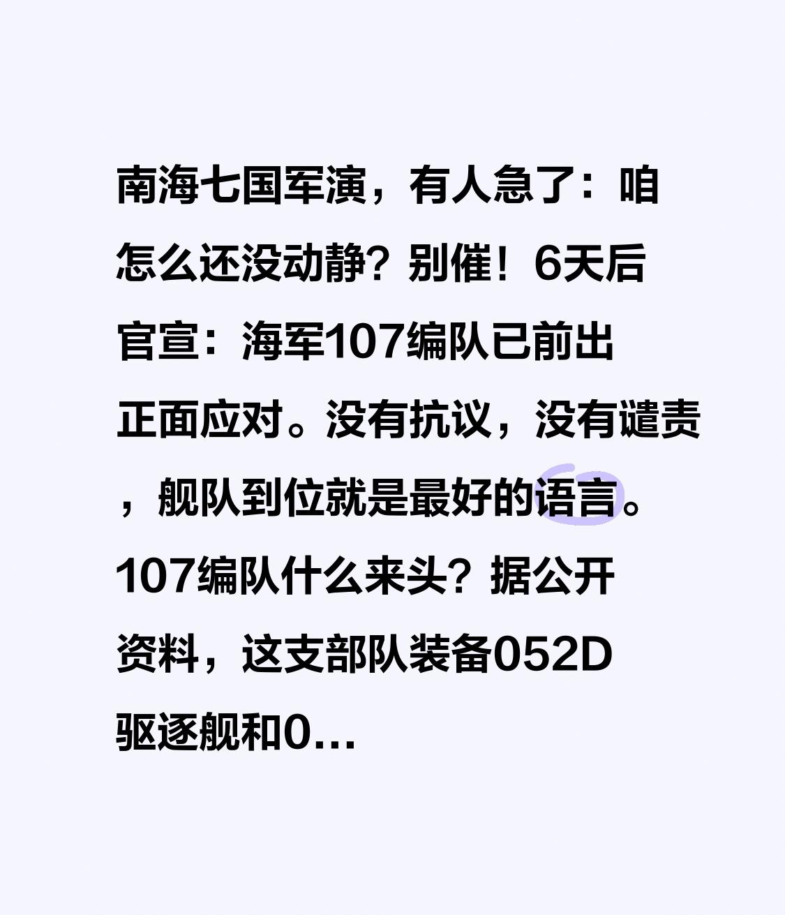南海七国军演,有人急了:咱怎么还没动静?别催!6天后官宣:海军107编队已前出正面应对。没有抗议,没有谴责,舰队到位就是最好的语言。107编队什么来头?据公开资料,这支部队装备052D驱逐舰和054A护卫舰,防空反潜样样在行。更重要的是:它出现在演习区域附近,本身就是一种态度——你演你的,我看着呢。为中国海军点赞!你觉得107编队能镇住场子吗?评论区等大神分析。