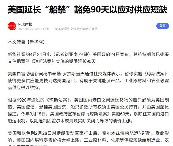 这次延长豁免,说白了就是让外国船能在美国自己的港口之间运东西,之前3月18号第一次豁免的时候,只给了60天,现在又加了90天,范围还是那些关键物资——煤炭、原油、汽油、天然气、化肥。