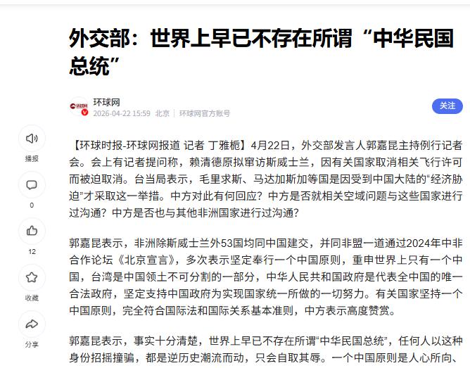 她还特别提到,赖清德最近想窜访非洲国家斯威士兰,搞点“外交突破”,结果因为多国拒绝发飞行许可,计划彻底泡汤了。