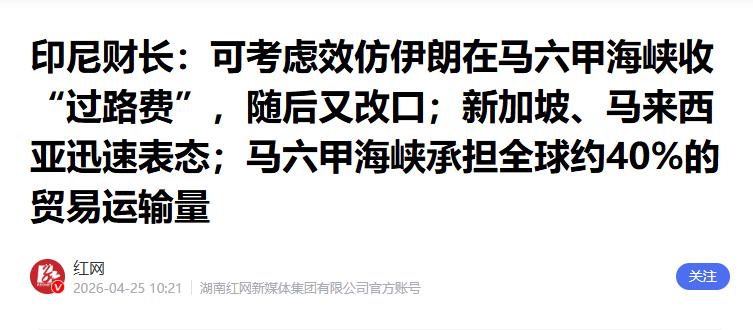 果然!伊朗开了个坏头,印尼直接跟风冲着中国来了!4 月 22 日据俄罗斯通讯社报道,印尼财长普尔巴亚在雅加达的讨论会上,明确效仿伊朗霍尔木兹海峡收费模式,提出要对马六甲海峡商船收过路费,直接瞄准中国这条海上贸易生命线。