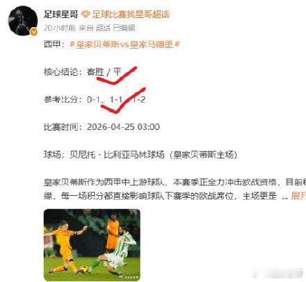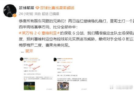 兄弟们,又是全红的一天!昨天两场焦点战全部拿捏,贝蒂斯 1-1 皇马、桑德兰 0-5 诺丁汉森林三天连中,星哥主打一个真实,不玩虚的! 今天继续保持连红势头!今天还有多场精彩比赛,星哥已经研究好了,想要跟单的兄弟抓紧时间,主页置顶!咱们继续红!足球预测 每日足球推荐