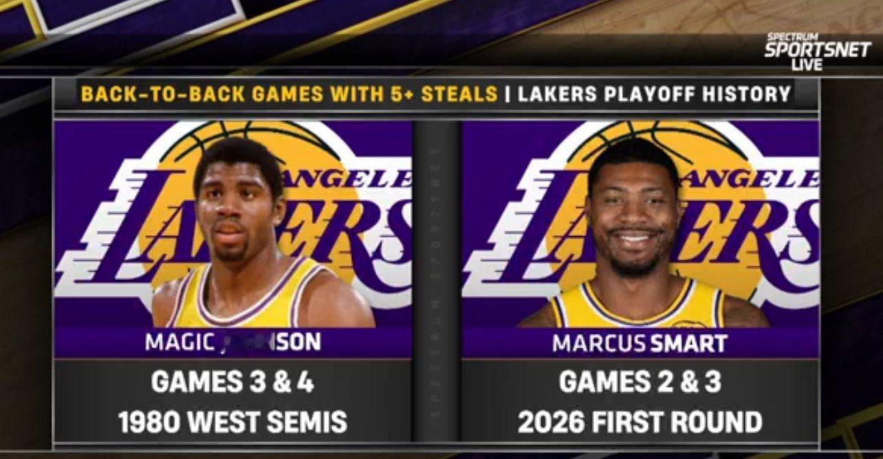 斯玛特成为湖人队史继魔术师后,第2位在季后赛单场至少20分+10助+5抢断的球员湖人3比0火箭
