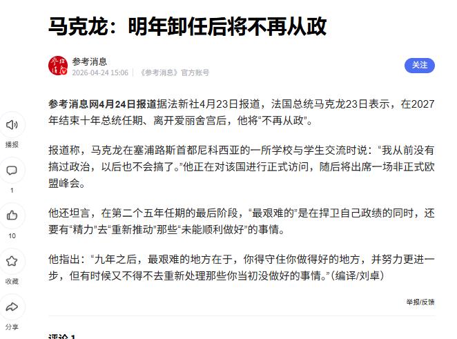 不干了!马克龙结束十年任期后将彻底退休,当地时间4月23日,法国总统马克龙在一场公开活动上表示,自己结束连续两届、十年任期后将彻底退休、不再从政,马克龙强调以后绝对不会再涉及政治,必然会回归生活。