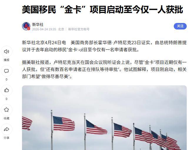 4月24日,美国商务部长卢特尼克在国会听证会上亲口承认,特朗普去年吹上天的那个移民“金卡”项目,折腾了大半年,结果一共就批了一个人!虽然卢特尼克嘴上还说“有几百人在排队”,想让人觉得生意挺火,但这跟之前他吹的“开售几天就卖了13亿美元”比起来,简直就是自己打自己脸。