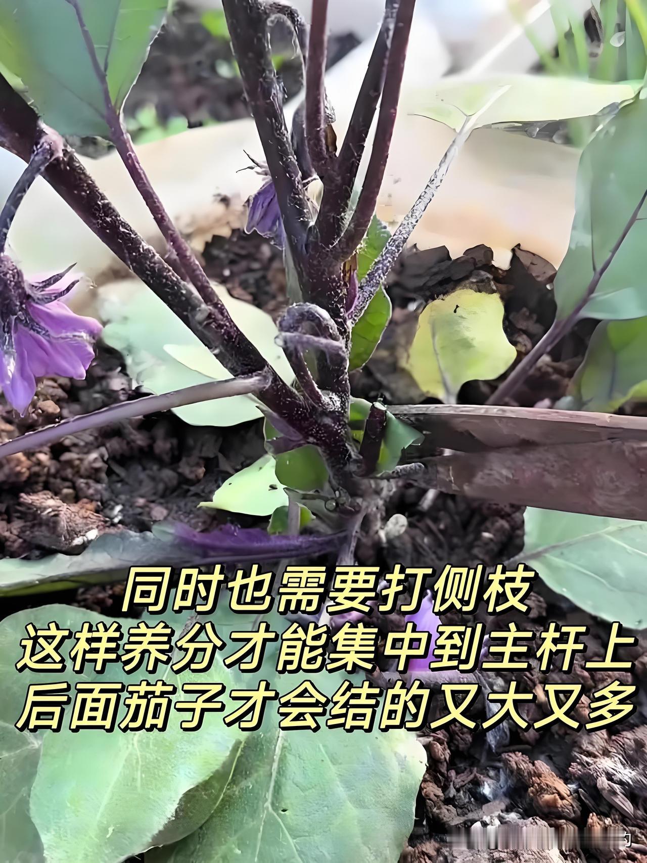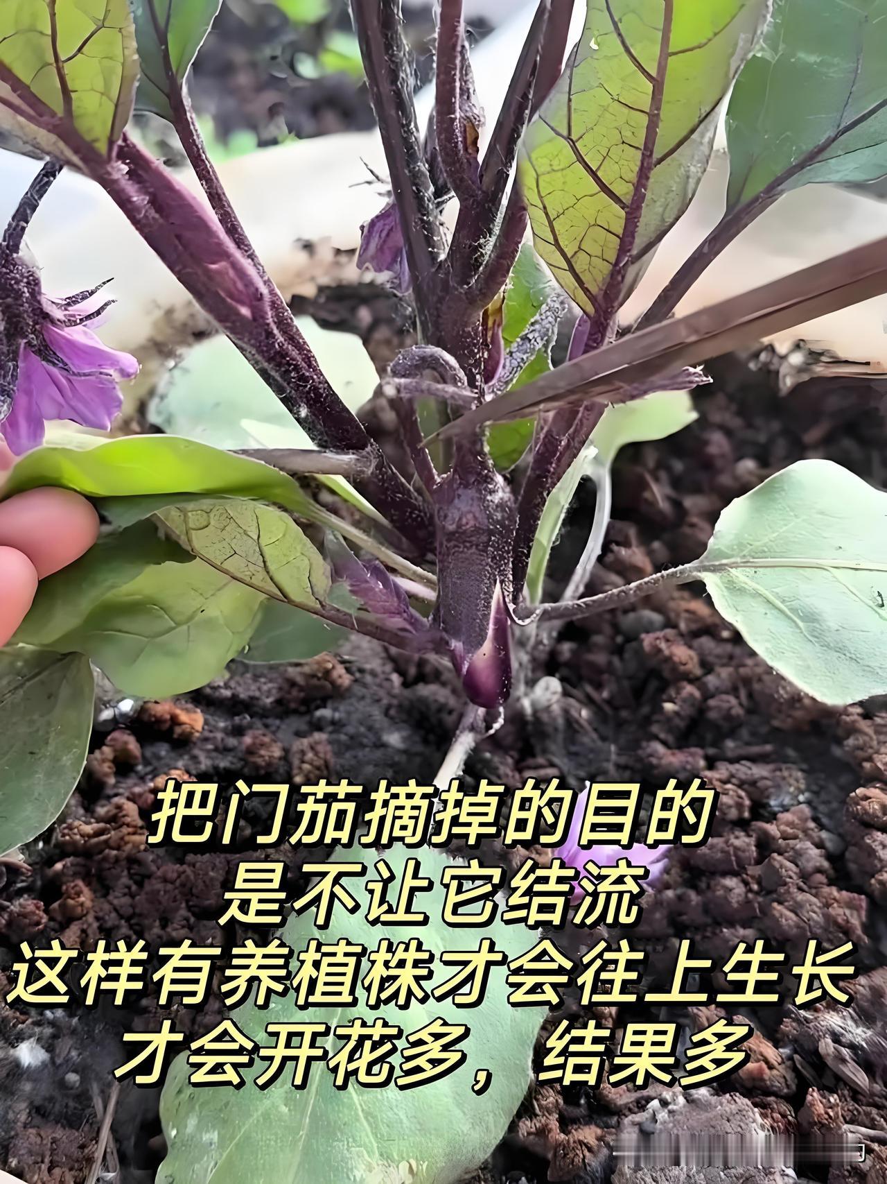 先别急着乐!要是你家茄子枝叶长得比较矮,这第一朵花(结的是门茄)可得赶紧剪掉!