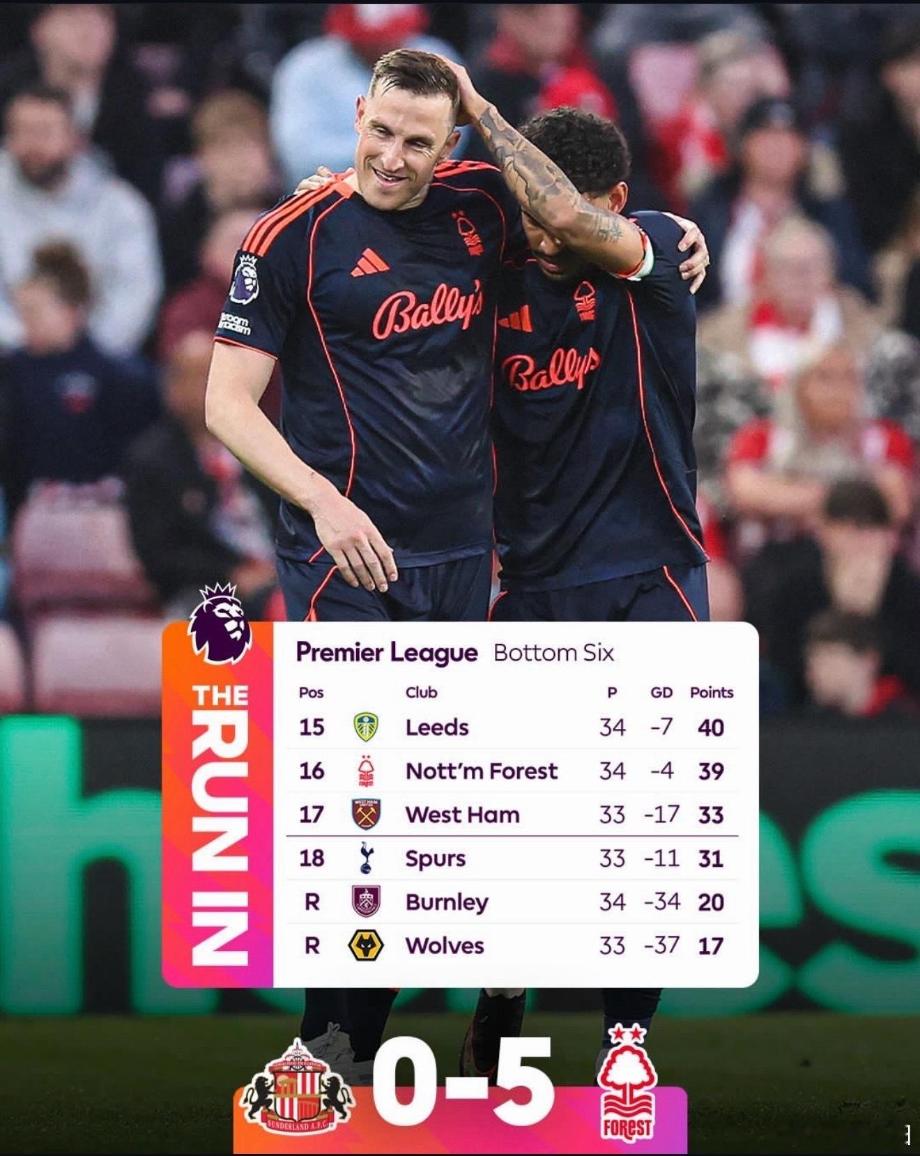 补报一条英超保级大战的最新消息。诺丁汉森林居然客场 5 比 0 大胜桑德兰!诺丁汉现在已经 39 分了,西汉姆 33 分,热刺 31 分。也就是说,英超最后一个降级球队,很可能就在西汉姆和热刺两支球队中产生!