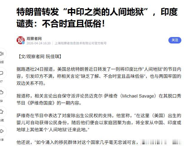 特朗普访华前夕,又在恶搞,侮辱中国人!特朗普4月23日转发了一条保守派评论员迈克尔·萨维奇发的帖子,该帖把印度和中国称为“人间地狱般的国家”,把来自这两个国家的移民称为“拿着笔记本电脑的流氓”。