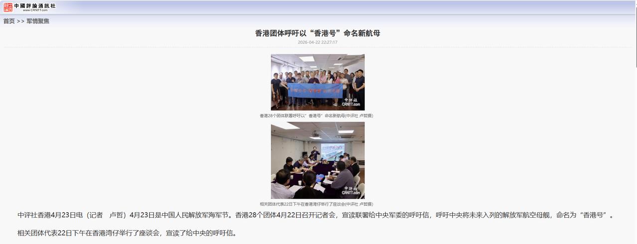 信息来源:中评社2026年4月22日关于《香港团体呼吁以“香港号”命名新航母》的报道