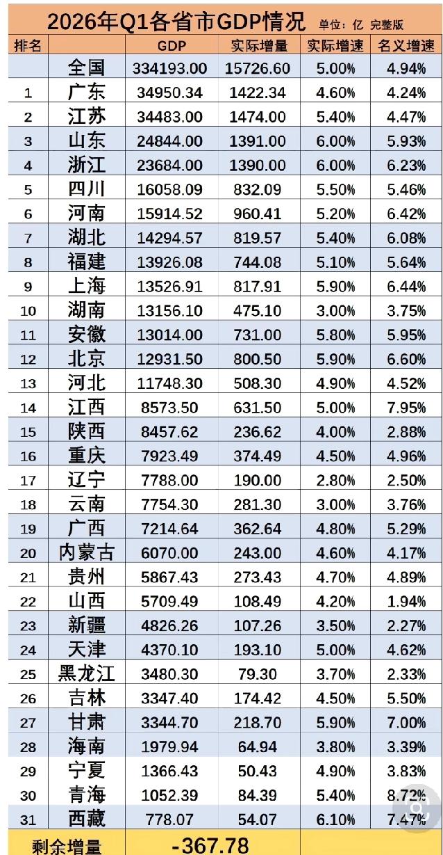 这不,截止4月25日,全国各省2026第一季度GDP数据出齐,东三省名义增速如下: