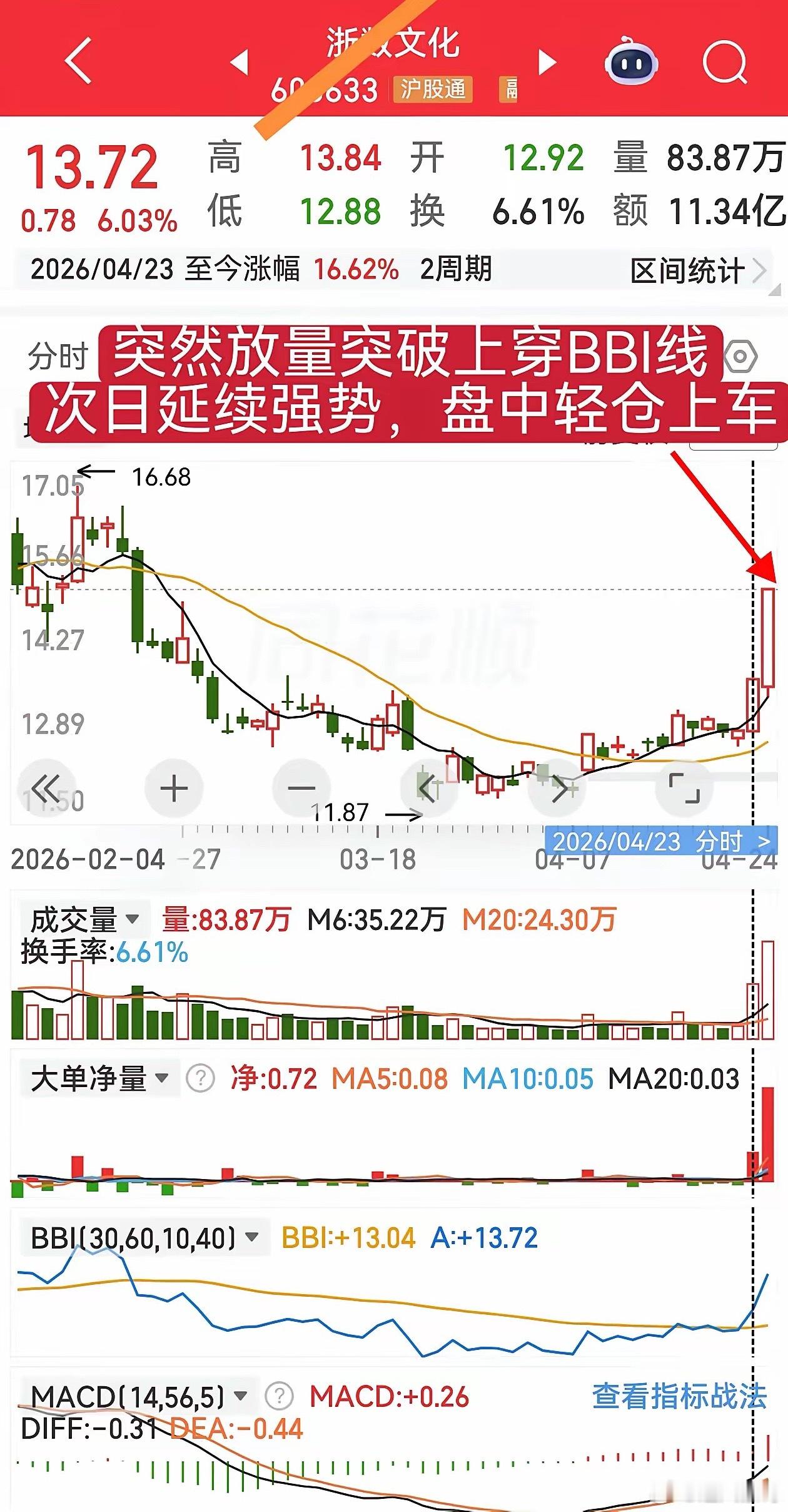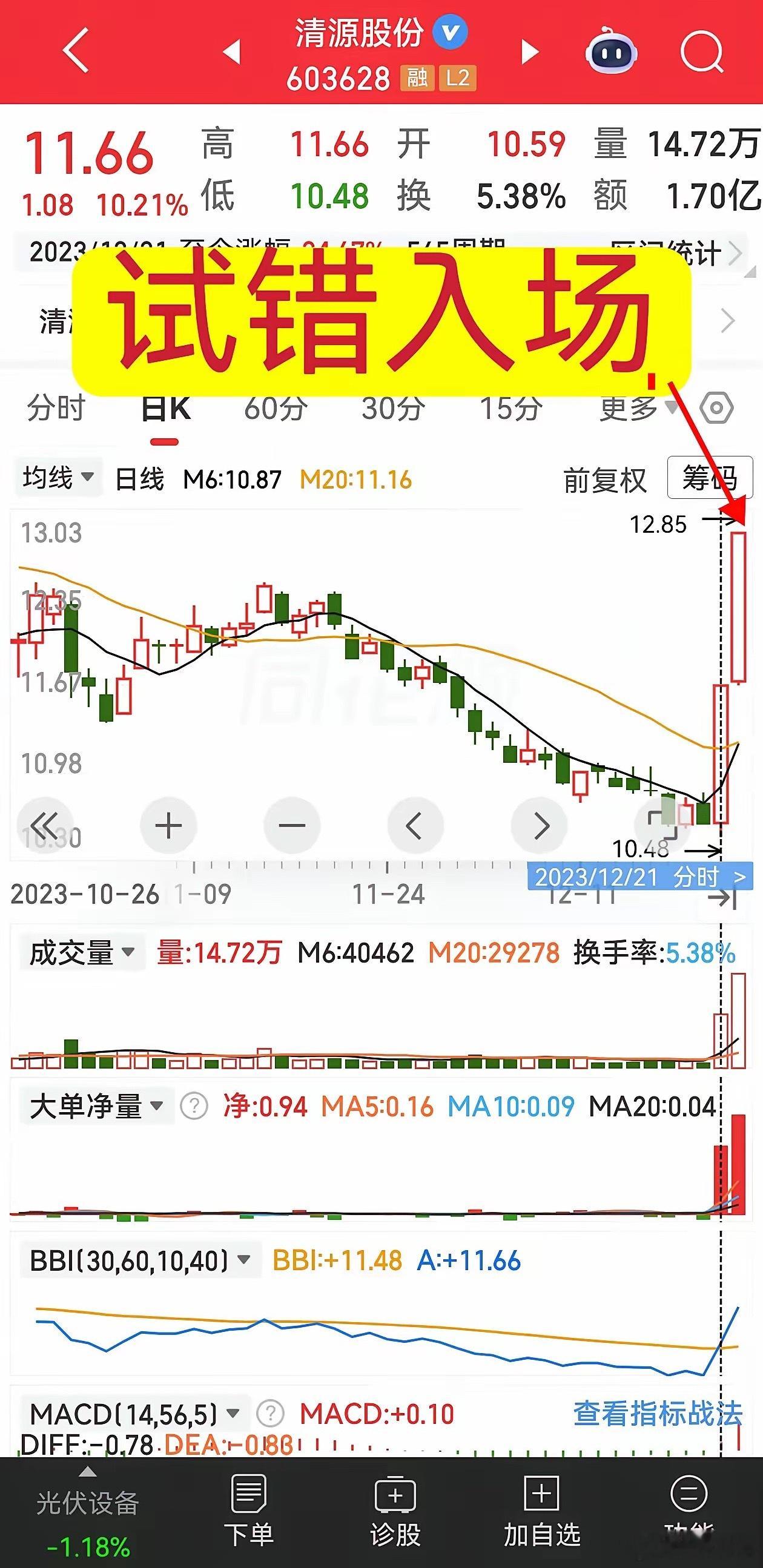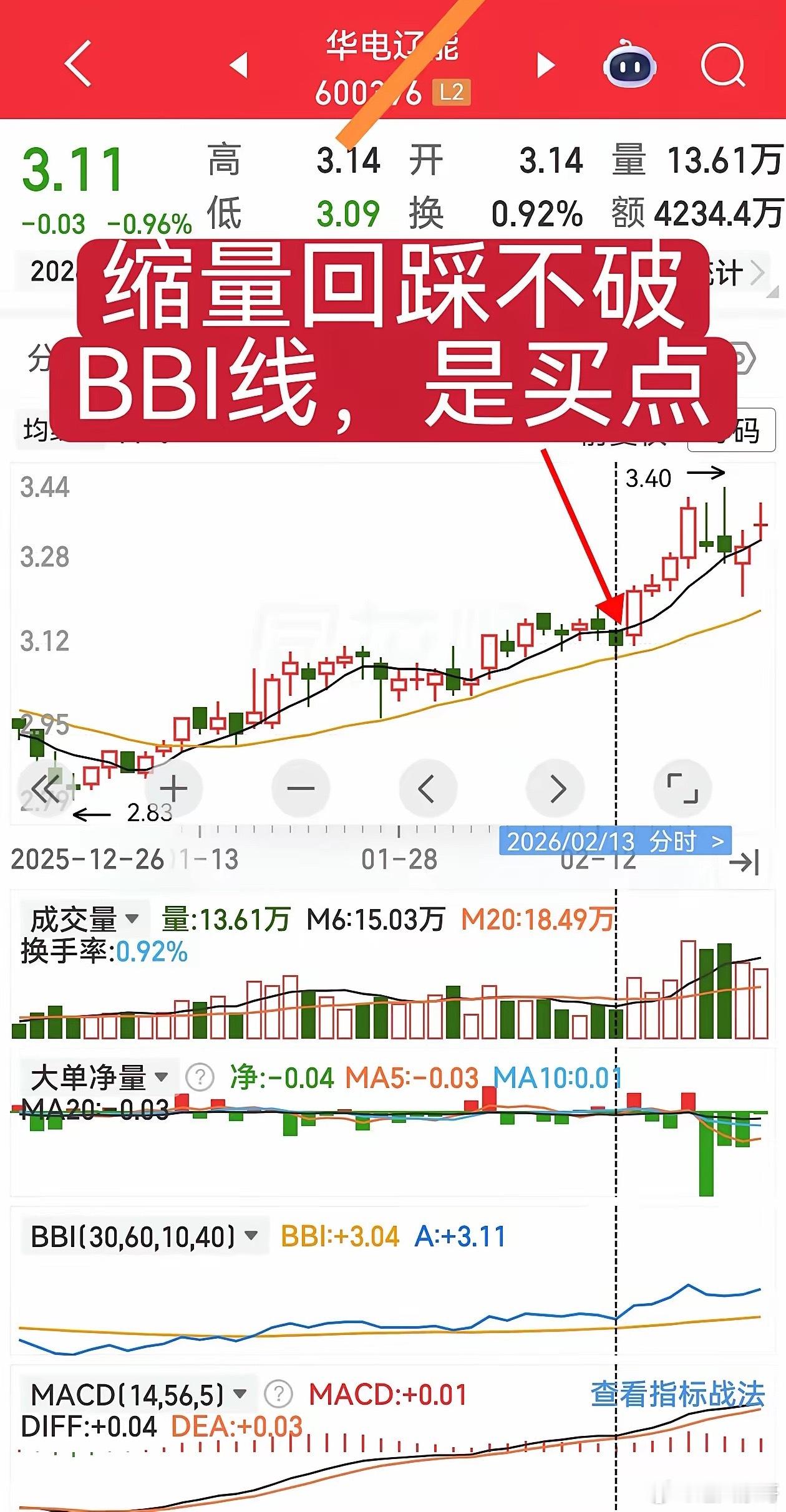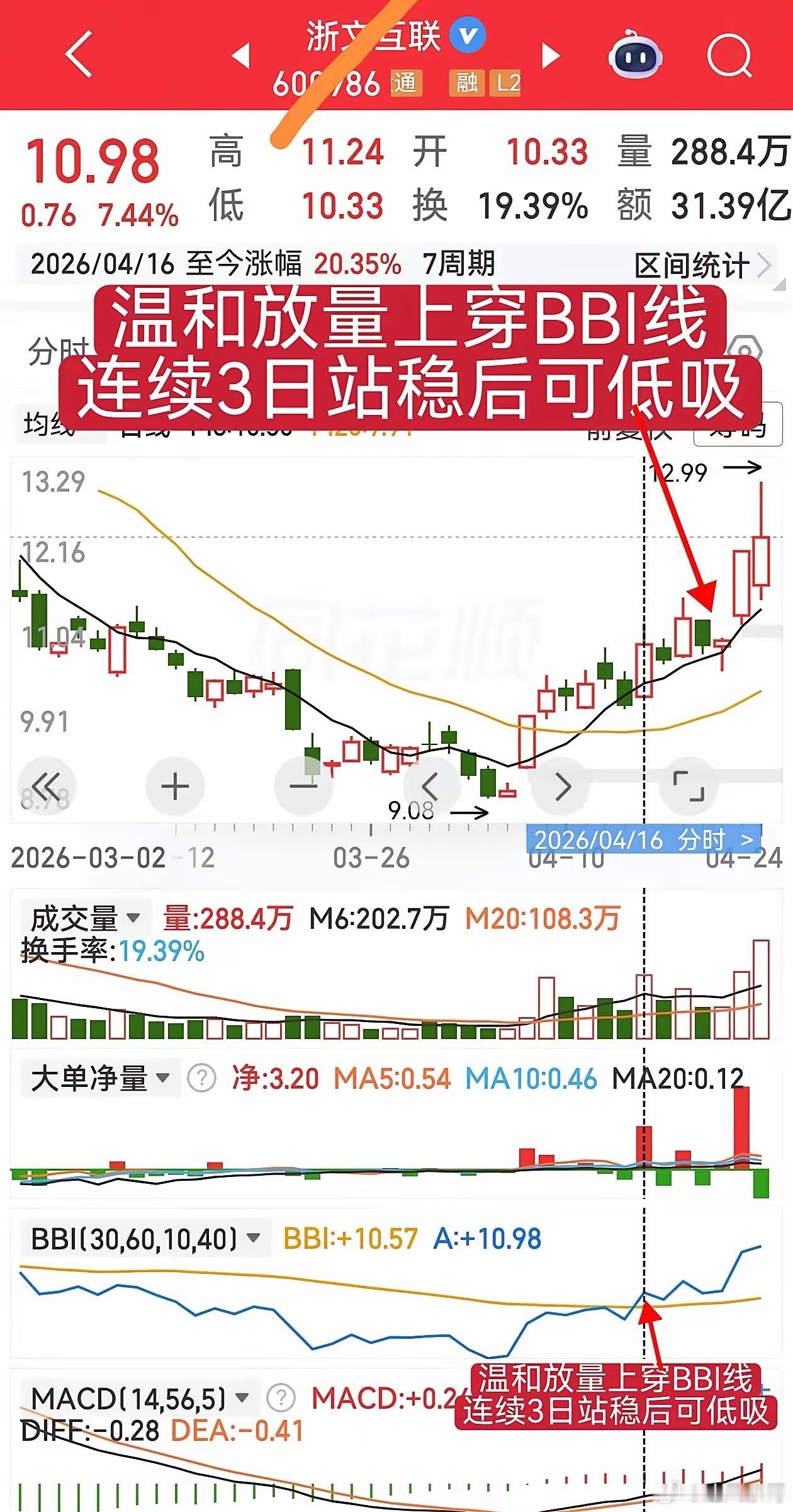 BBI抄底战法一一买点的确定。一、利用BBI抄底的三种买入形态1. 温和放量低吸:股价经过大幅下跌见底企稳,成交量温和放大,量线多头排列;股价连续3天站稳BBI上方,底部小幅回升,适合轻仓试错布局。(见图一、二)2. 放量突破慎追:下跌末期出现中大阳线,同步放量直接上攻突破BBI,代表主力资金进场,多空力量反转,短线反弹确定性高。次日若能延续强势,也可在盘中轻仓追高入场。(见图三、四))3. 缩量回踩低吸:首次站上BBI后小幅回调,回踩不破BBI线,同时成交量萎缩,是最稳妥的二次上车黄金买点。(见图五、六)二、必看配套确认条件1. 量能配合:突破BBI必须放量,证明资金真实做多;回踩过程必须缩量,说明空头抛压耗尽。2. 指标共振:低位搭配MACD底背离或多头排列,多重指标同步走强,过滤虚假上涨信号。3. 形态周期:底部出现止跌K线,日线BBI信号搭配周线趋势走强,行情更持久、更安全。三、硬性风控止损纪律1. 短线止损:有效跌破BBI支撑,直接离场规避深套风险。2. 时间止损:放量突破后连续三天站不稳BBI,说明做多力度不足,果断撤退不恋战。