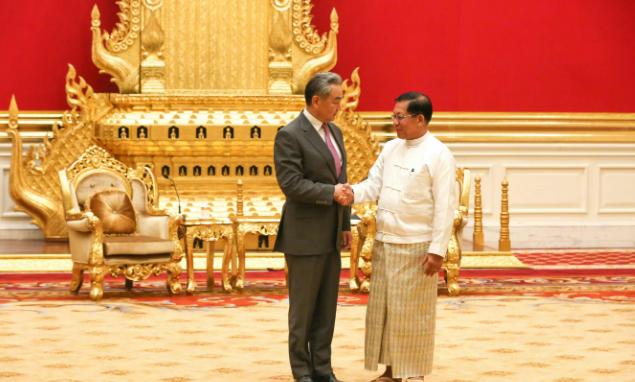 当地时间4月25日,缅甸新任总统敏昂莱在内比都会见了中国外交部长王毅。