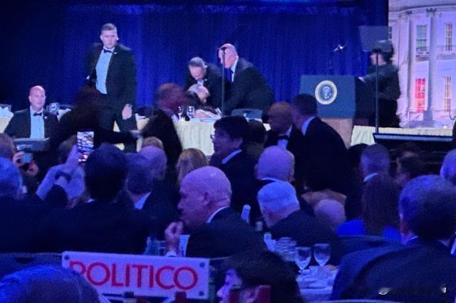 福斯新闻主播罗伯茨(John Roberts)在现场表示,确实听到了枪声,且有消息称嫌疑枪手已被特勤局制服。随后,特朗普夫妇在严密保护下迅速离开了宴会厅。现场画面显示,多名持枪的特勤局干员迅速进入核心区域,展开戒备。
