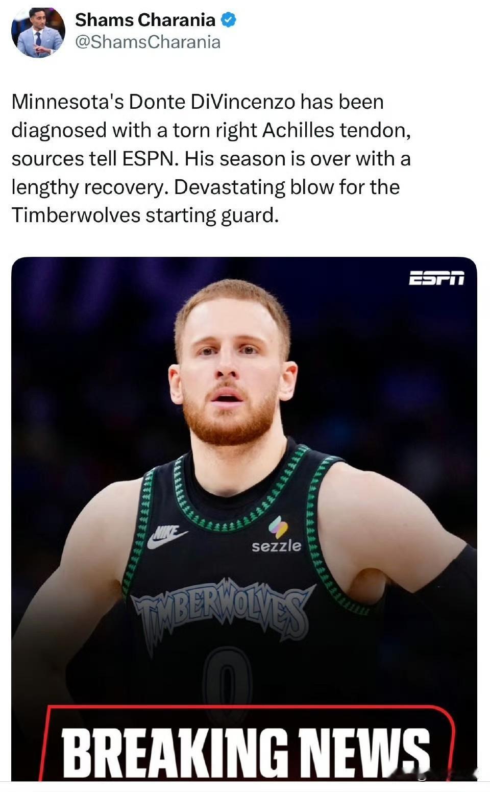 今天,森林狼队主力轮换迪文琴佐在首节10分41秒时遭遇了小腿无对抗受伤,返回更衣室后坐着轮椅前往医院做核磁共振检查,如今检查结果已经出来。据权威记者Shams报道:迪文琴佐遭遇了右腿跟腱撕裂,本赛季报销,他将无缘森林狼队接下来的季后赛之旅。迪文琴佐是球队重要的得分、组织手,他的赛季报销对球队来说无疑是一个噩耗!