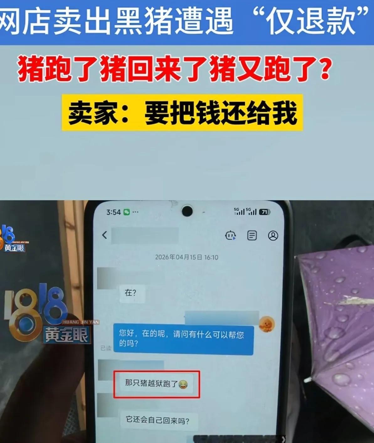 参考信息:新浪新闻.(2026-04-26).网购的猪“越狱”买家申请仅退款退款后猪又跑回来了。