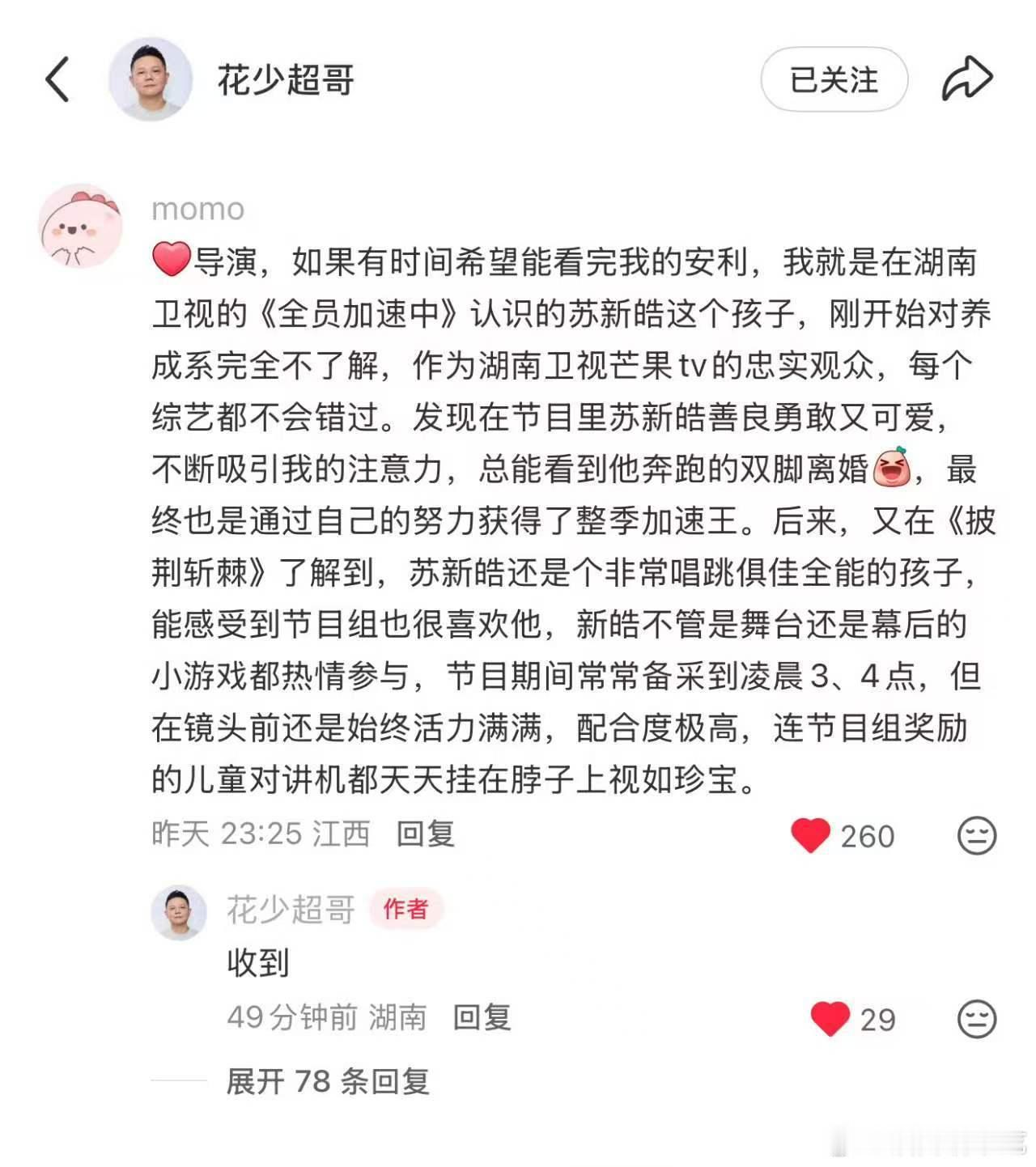 花少导演收到苏新皓粉丝安利 花少导演也被粉丝安利到苏新皓了!不过这么真诚可爱善良