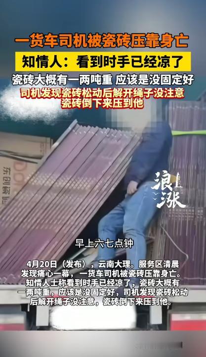 这事其实一点都不复杂,司机把车开进服务区后,发现捆货的绳子松了,想着赶紧重新绑紧,免得上路出问题,结果就在整理的那几秒钟里,整堆瓷砖失去支撑,直接倒下来,把人压住。
