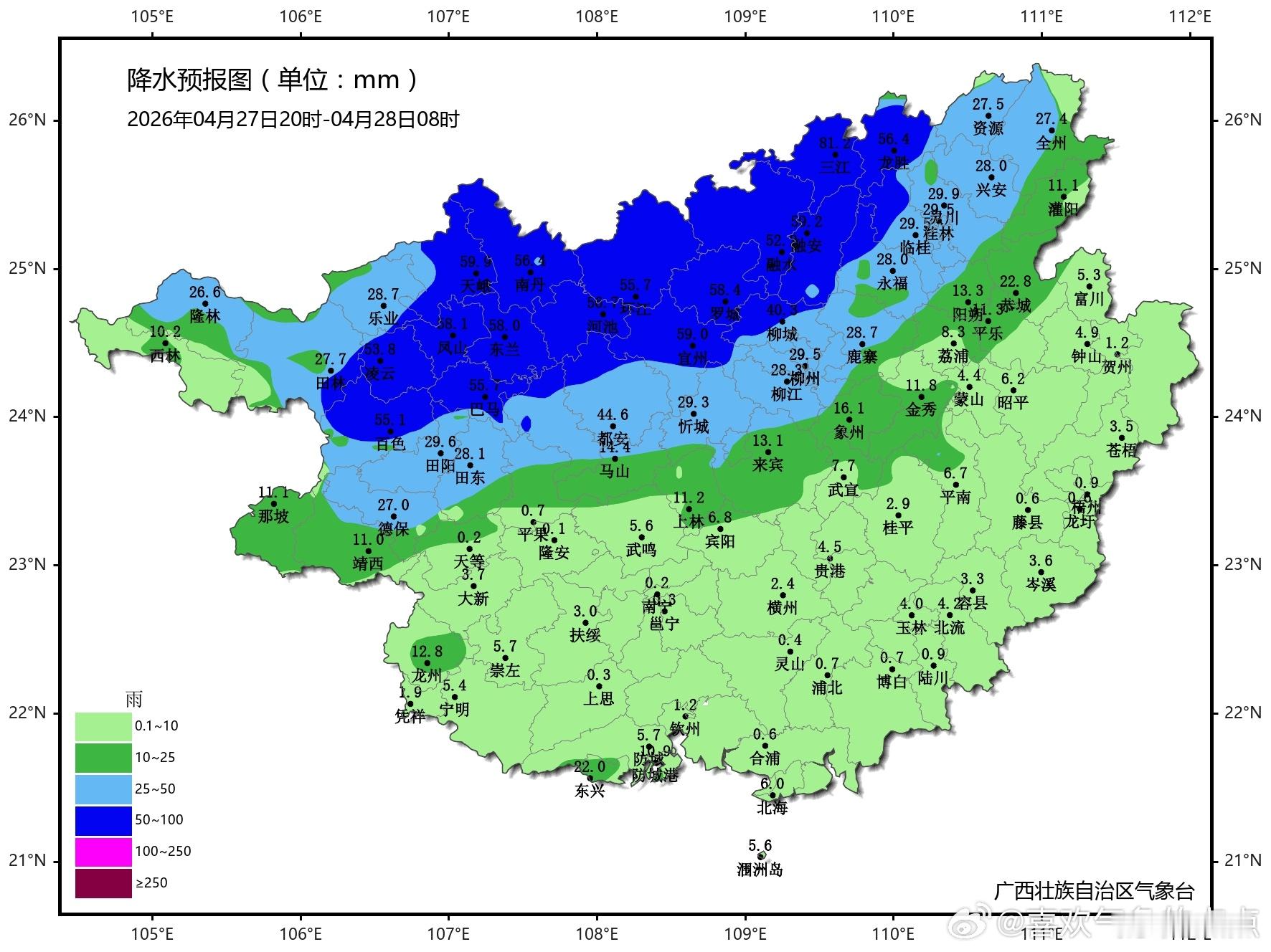 广西天气【强对流天气防御工作提示信息】据预报,4月26日夜间至28日,我区自北向南将有一次大雨、局地暴雨或大暴雨并伴强对流天气过程。过程累计雨量:桂北50~120毫米、局地200毫米以上,桂南20~60毫米。预计未来1到3天,龙江部分支流,古宜河上游,桂江上游,湘江上游及支流灌江、资江、贺江上游等江河可能出现1~3米的明显涨水过程。桂林、柳州、河池等市的强降雨与上次降雨重叠,引发的山洪、地质灾害和城乡渍涝等风险较高。(广西壮族自治区防汛抗旱指挥部办公室,广西壮族自治区安全生产委员会办公室)气象观察团暴雨强对流