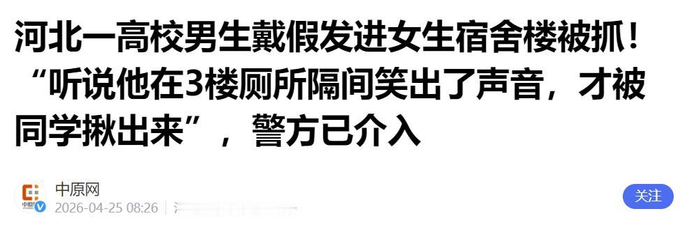4 月 23 日晚间,河北保定一所高校内发生一桩令人极度不适的闹剧。一名本校男生提前做好伪装,佩戴假发刻意掩饰自身性别特征,借机混入女生宿舍楼内,躲藏在楼层卫生间中。