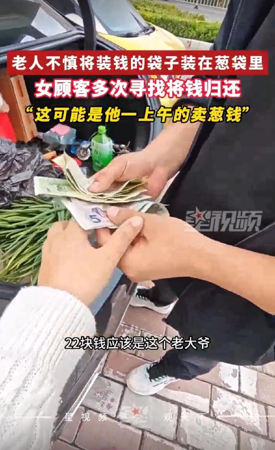 河南濮阳,女子在大爷摊位买葱花,回家后意外发现,葱袋子里竟有22元现金。女子觉得这钱是大爷不小心落下的,她返回去找大爷,可大爷却不见了,女子不放弃,在菜市场找了2天,终于找到卖菜大爷,将钱财如数归还,大爷万分感谢。