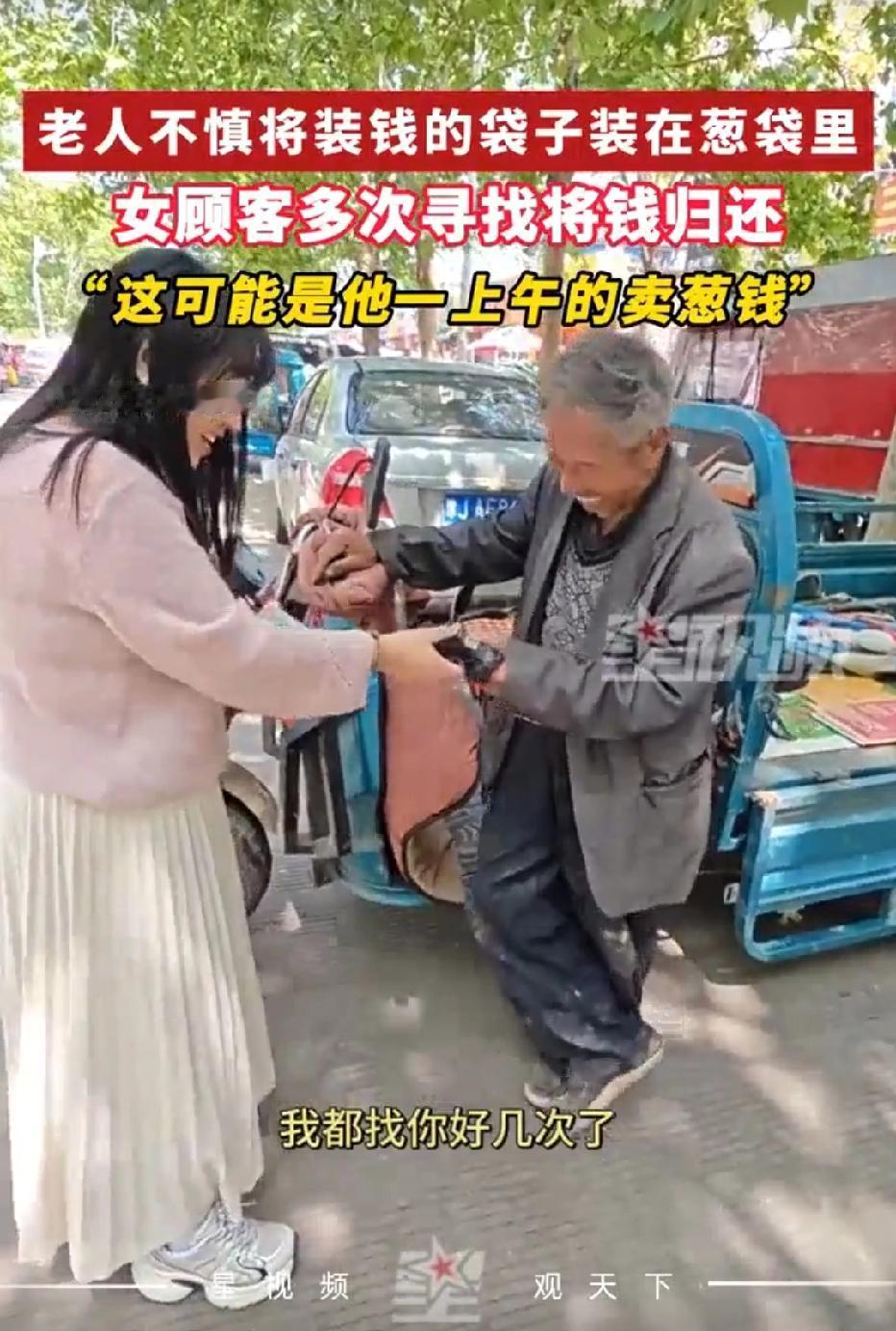 大爷听完之后才恍然大悟,自己一直不知道钱遗失在了葱花袋里,得知女子专门找了自己两天还钱,内心十分意外,也十分感动。