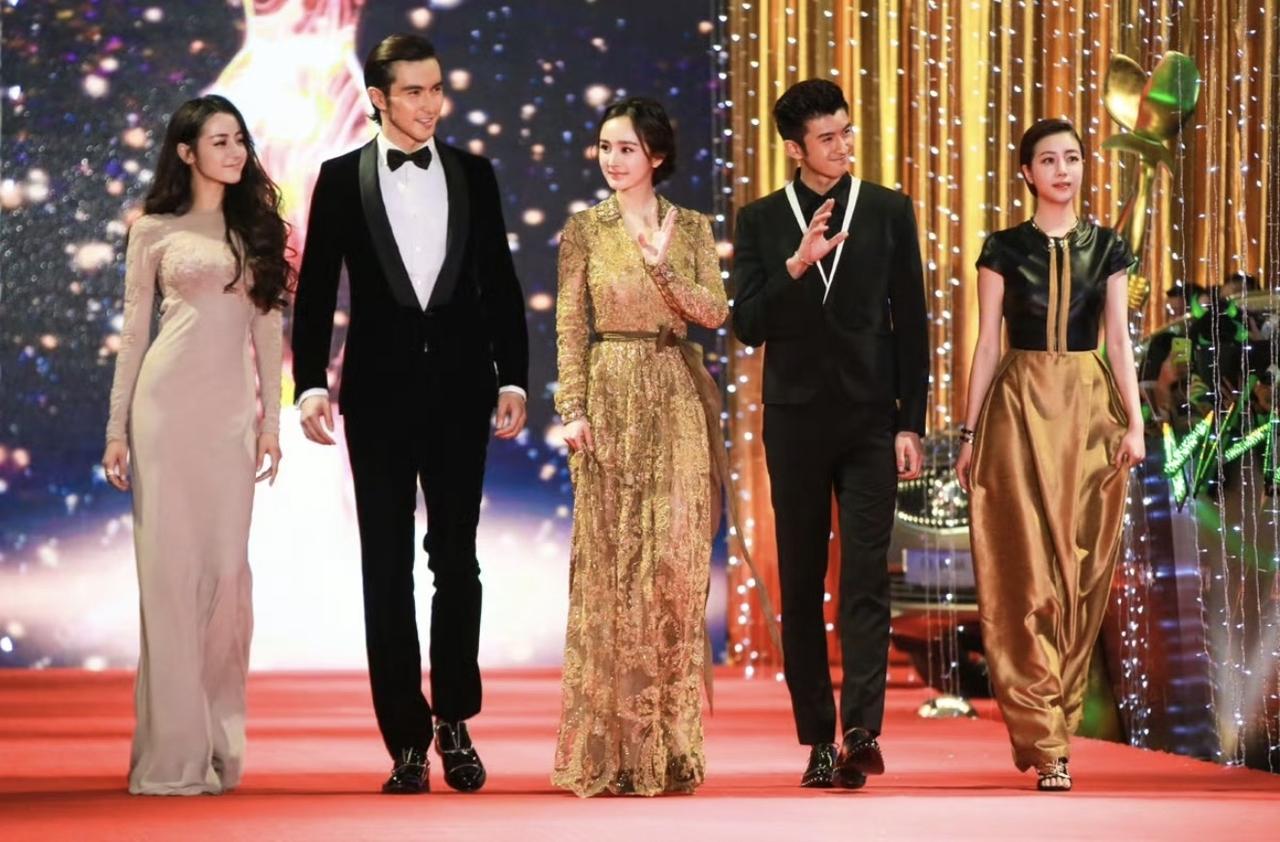 2014年,杨幂带着旗下艺人迪丽热巴、高伟光、张云龙、李溪芮走红毯时的画面。