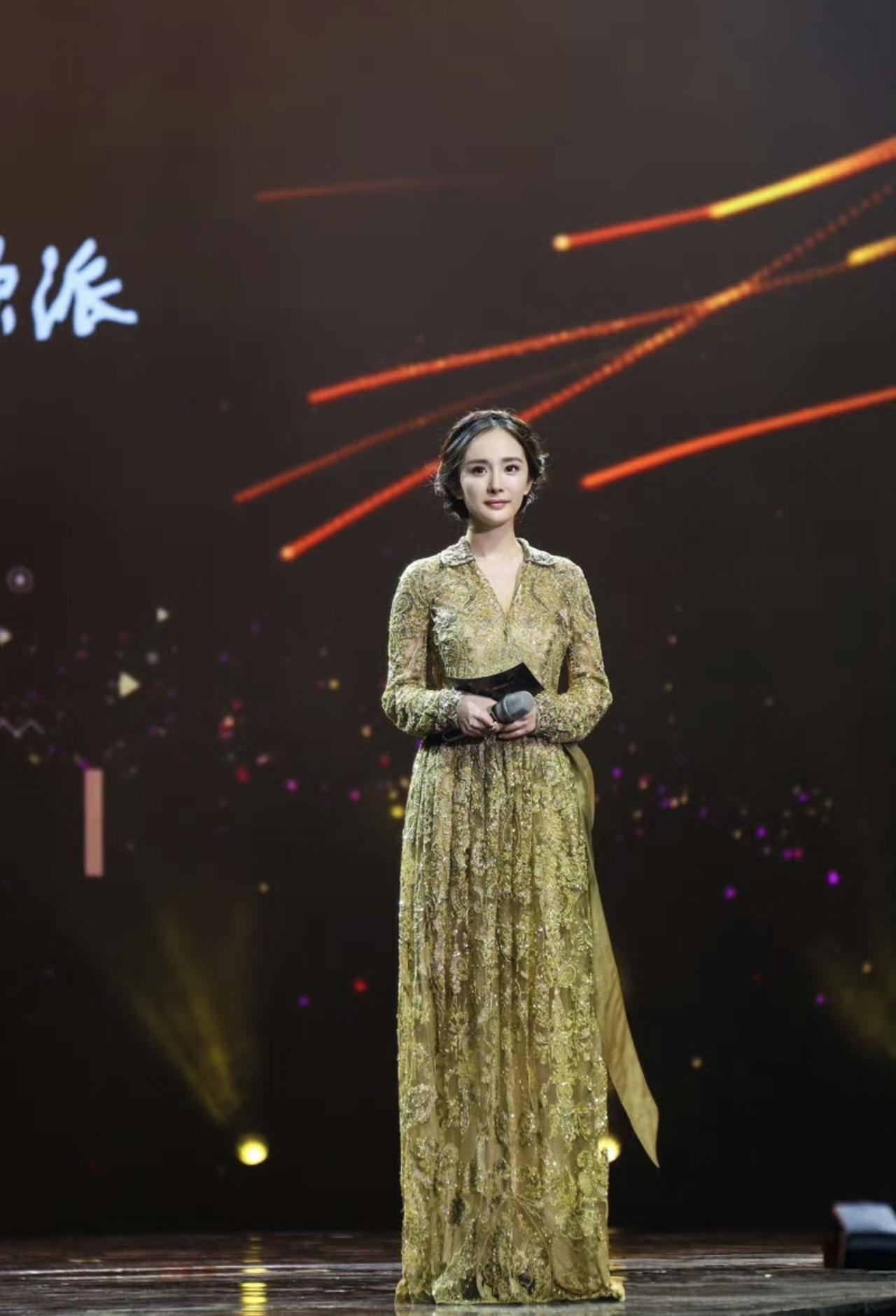 当晚,杨幂身穿金色薄纱礼服裙,温婉动人又nice,与现场多位演员大咖互动交流、合影,很有体面感。