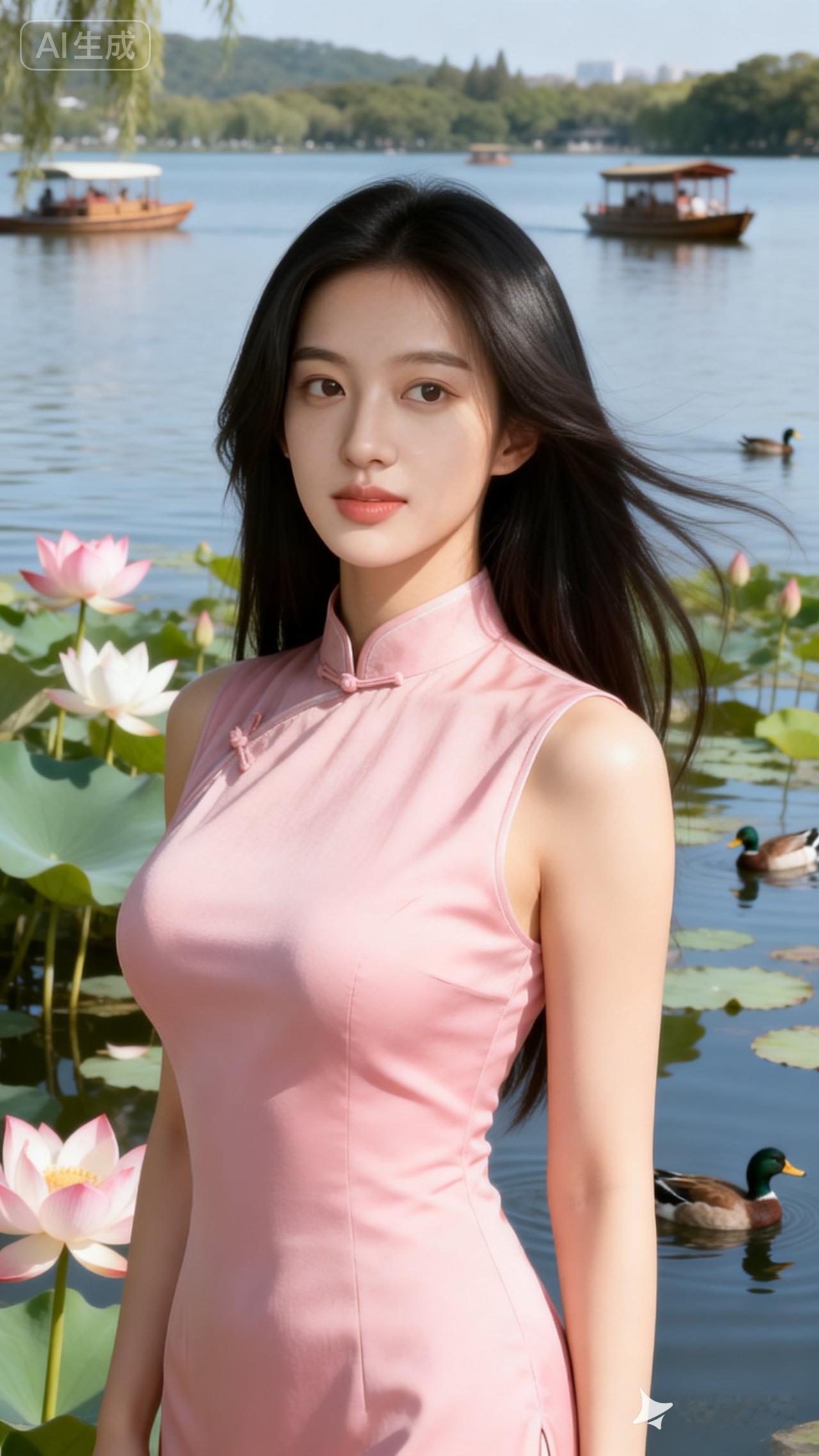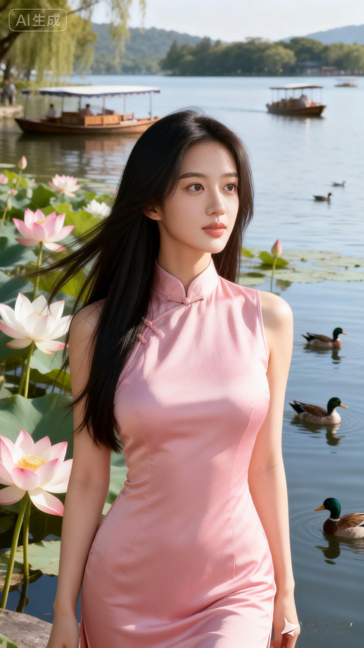 粉色旗袍少女,湖畔赏荷,夏日悠然