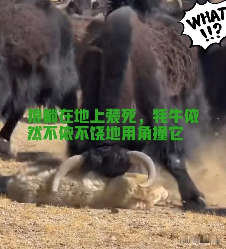 怎么,那只牦牛根本不买账,继续、反复用头上的角去撞(拱)已经躺在地上装死的狼……