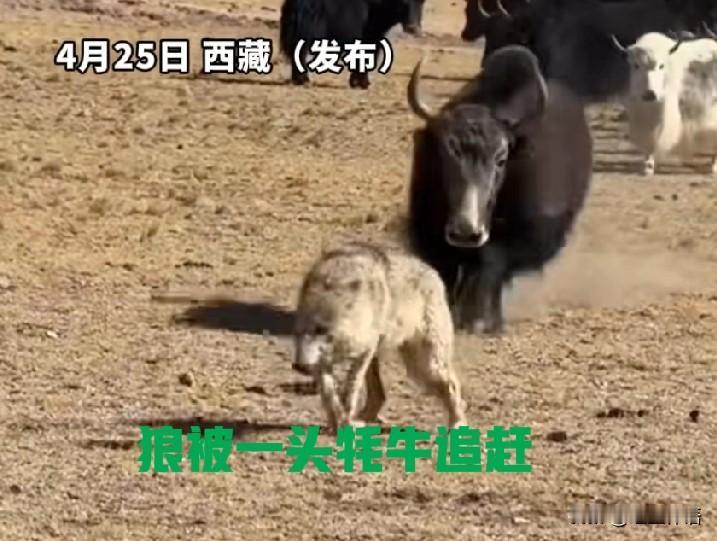 一头狼,被一群牦牛追赶,一种,一头牦牛眼看就要追上那只狼了。