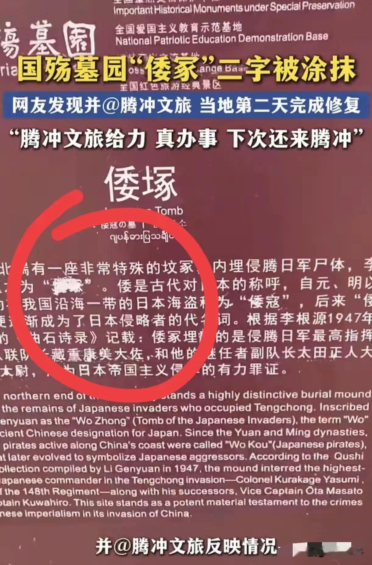 4月23日,云南腾冲国殇墓园出事了!一名游客发现"倭塚"石碑上,"倭"字被人用涂料恶意涂抹!字迹模糊不清。游客当场拍照,发到网上@腾冲文旅,照片迅速传开,登上热搜。