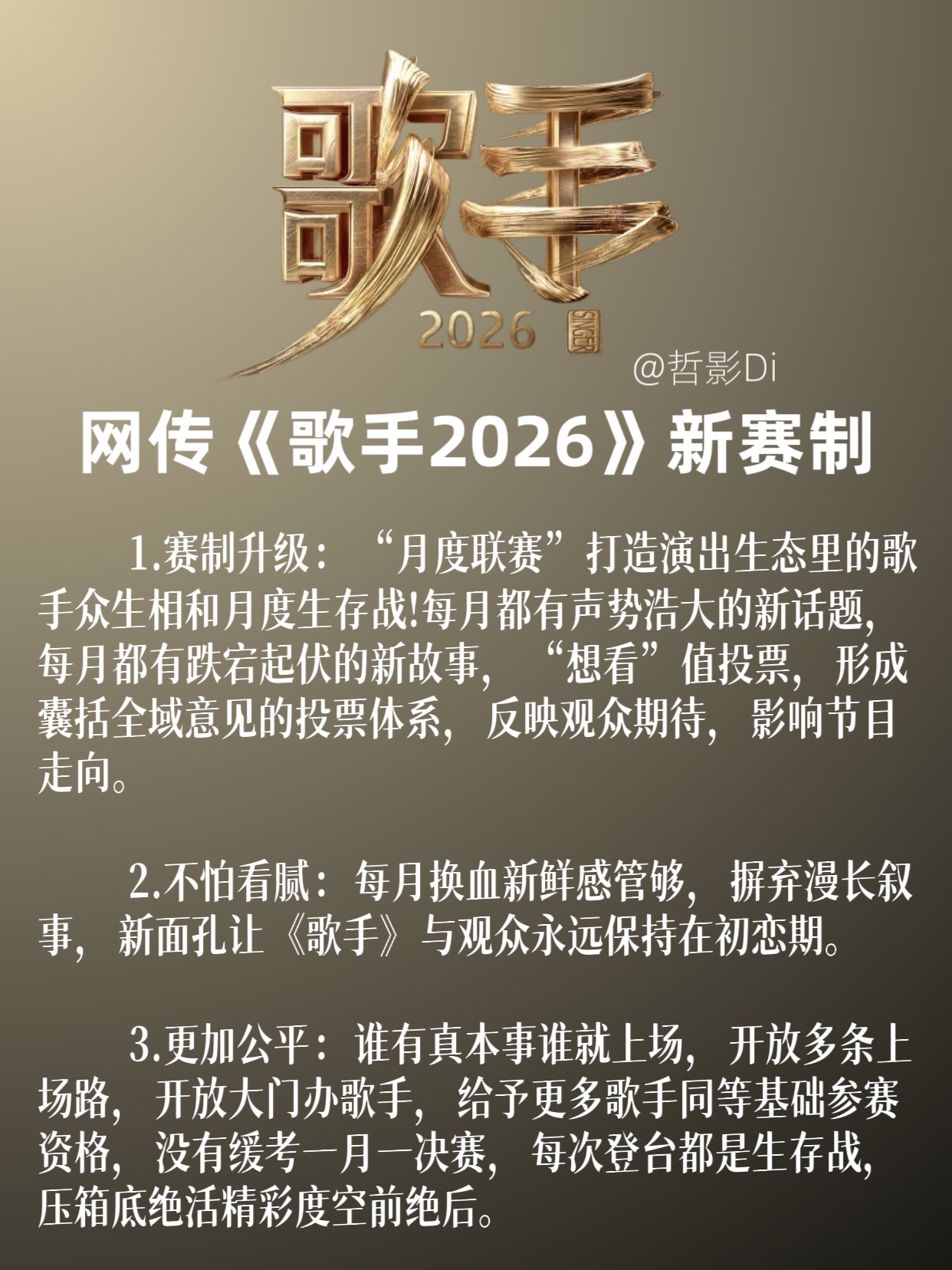歌手要变年综吗网传《歌手2026》将改编赛制,原本的每周的比赛改为“月度联赛”,通过想看值投票进行排名。每月都有新歌手加入,开放多条途径让更多歌手能够上《歌手》舞台,每个月一场决赛。通过逐月的舞台对决,最终决出本季歌王。