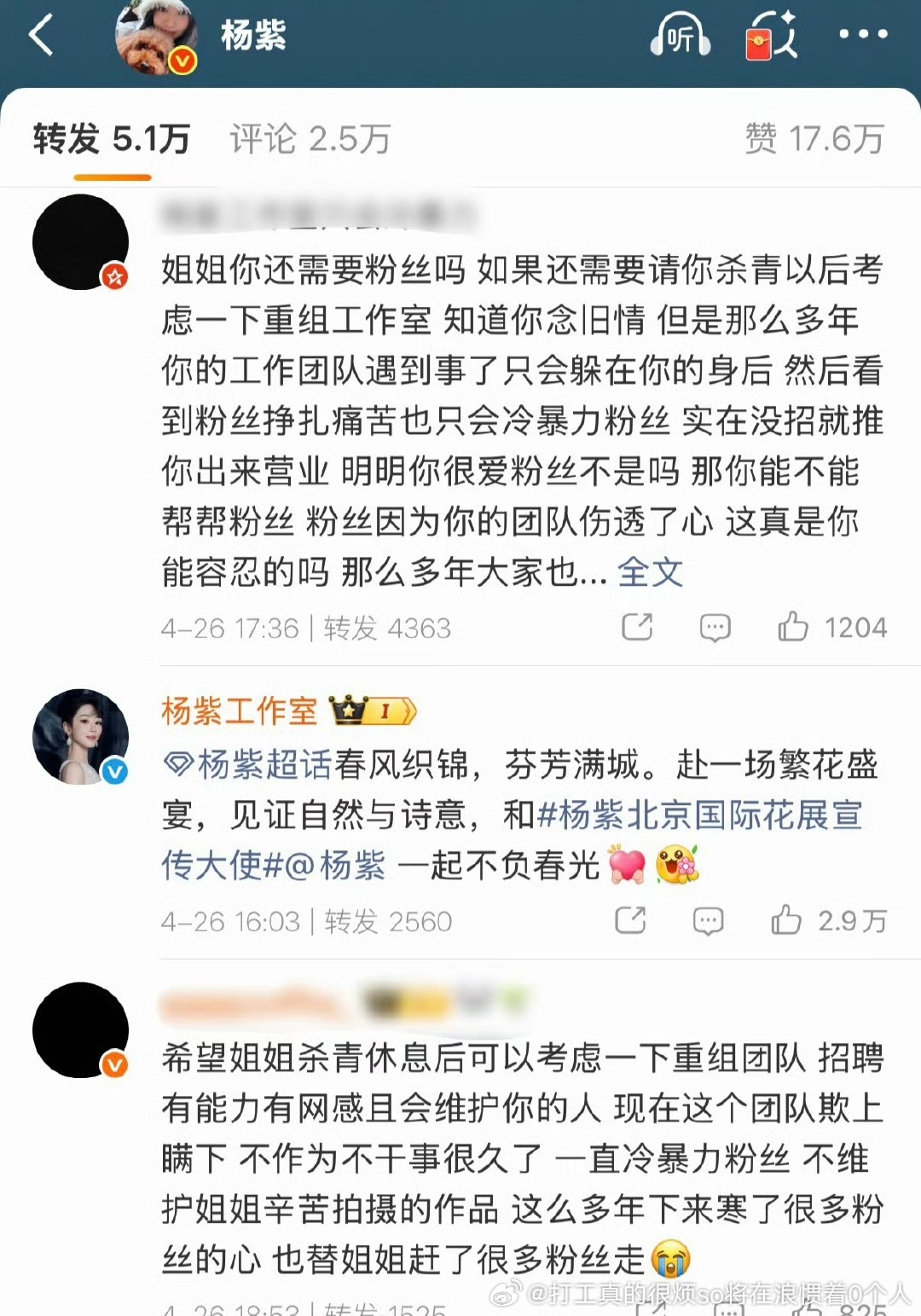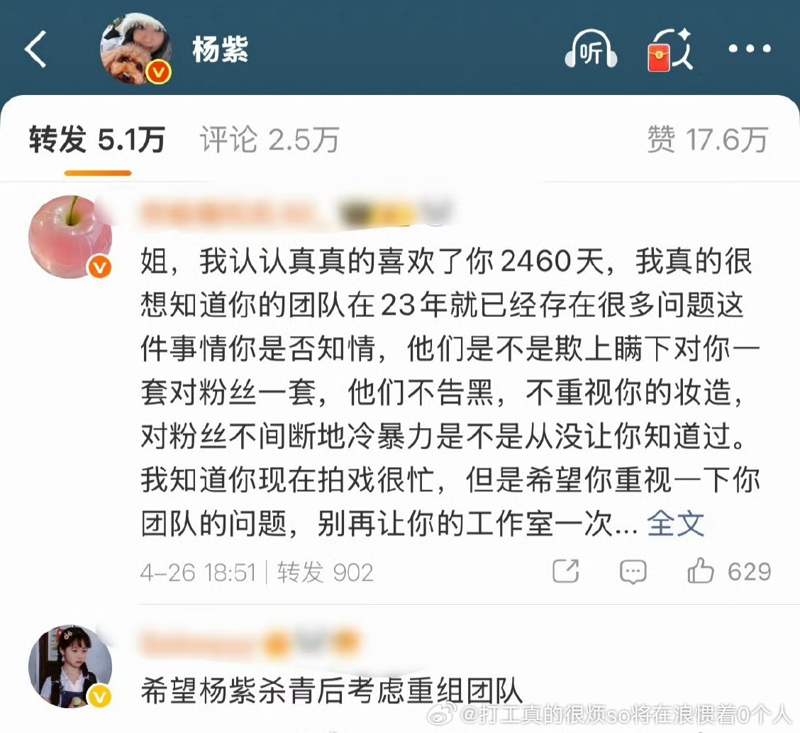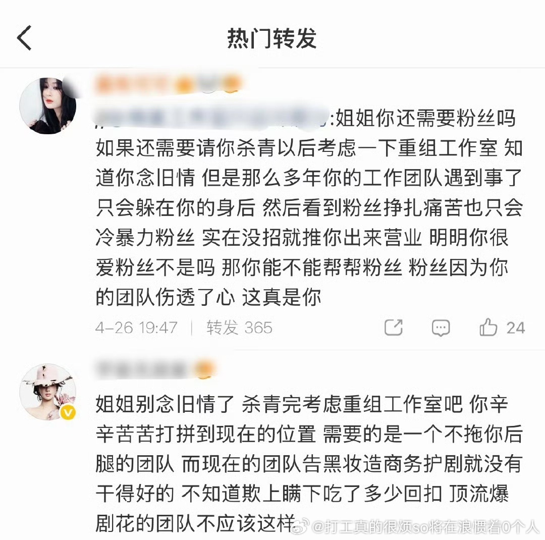 自己都说了“早在XX年都有问题”早不大撕?哦,那时候火剧压住了,没雪扑啊撕一撕失败好找借口“姐姐我好爱你都是团队好气人”跑路.说白了99.9%的艺人心中亲戚和团队比远在天边不知道啥时候跑路的粉丝亲近太多了