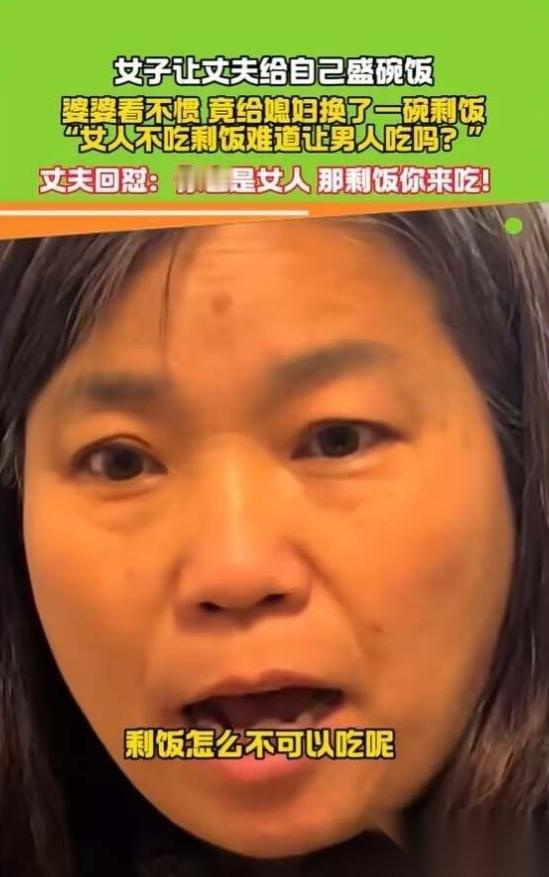 太解气了,还好丈夫不是愚孝男。江西,一婆婆因不满自己的儿子为儿媳添饭,转身端了一碗剩饭给儿媳,表示女人就要吃剩饭。这老太太摆谱,可不是临时起意。平时她就见不得儿子沾家务,大姑姐回门,还要硬逼着媳妇下桌去后厨干活。这就是打着老规矩的旗号,在家里争权夺势。
