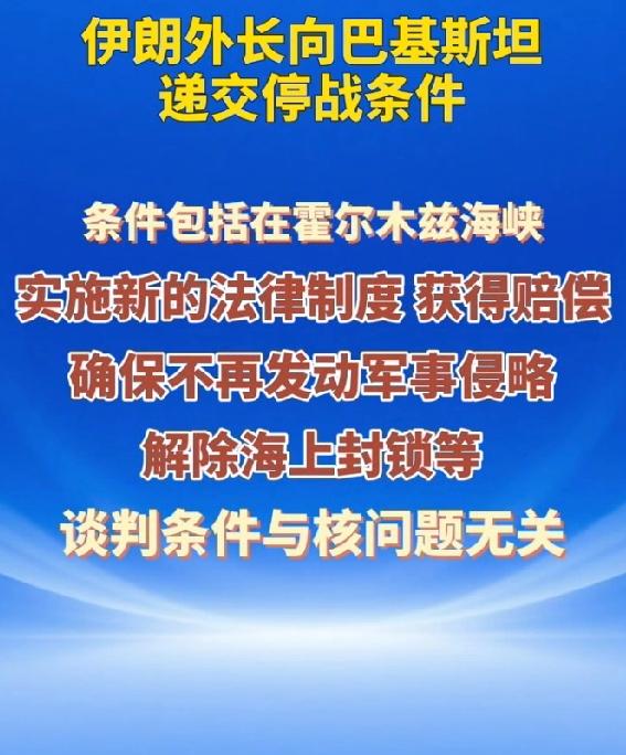 伊朗外长阿拉格齐26日向巴基斯坦递交的停战条件主要包括四个核心要点:在霍尔木兹海峡实施新的法律制度、获得战争赔偿、确保美国不再发动军事侵略、解除海上封锁。