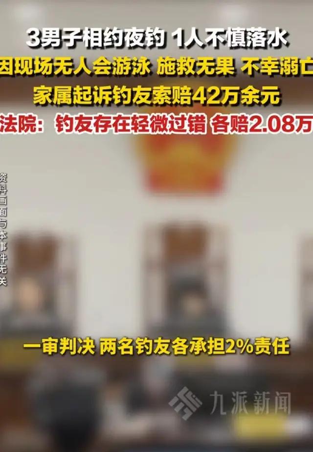 两名同行钓友雷某、冉某,各自承担2%的次要责任,分别赔偿家属2万余元 。法院认为,三人相约夜钓,形成了临时的安全帮扶义务,两人未及时劝阻张某的危险行为,未尽到提醒照看责任,存在轻微过错。