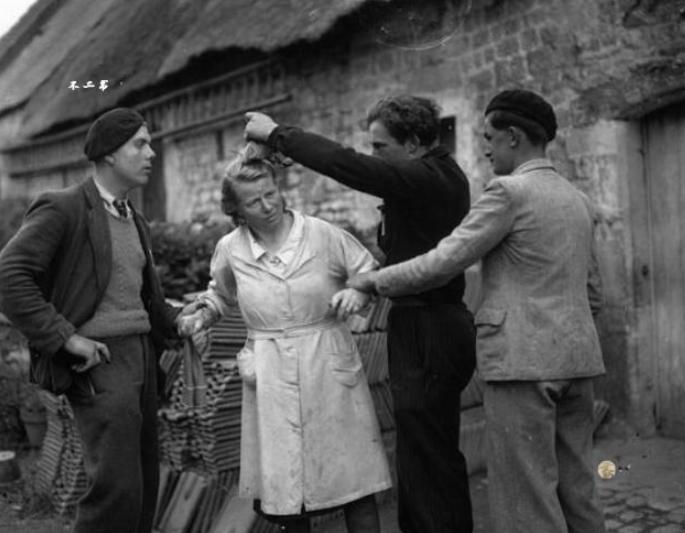 但在战后的法国,没人听她们的辩解,1944到1945年从巴黎到外省,暴力羞辱无处不在,布列塔尼小镇上11名女性被拖到街上,剃刀不够就用剪羊毛的大剪刀,头发散落一地,围观民众鼓掌叫好,第戎的女性被扒掉上衣,挂上纸牌游街,走不动就被拖拽,膝盖磨得鲜血直流。