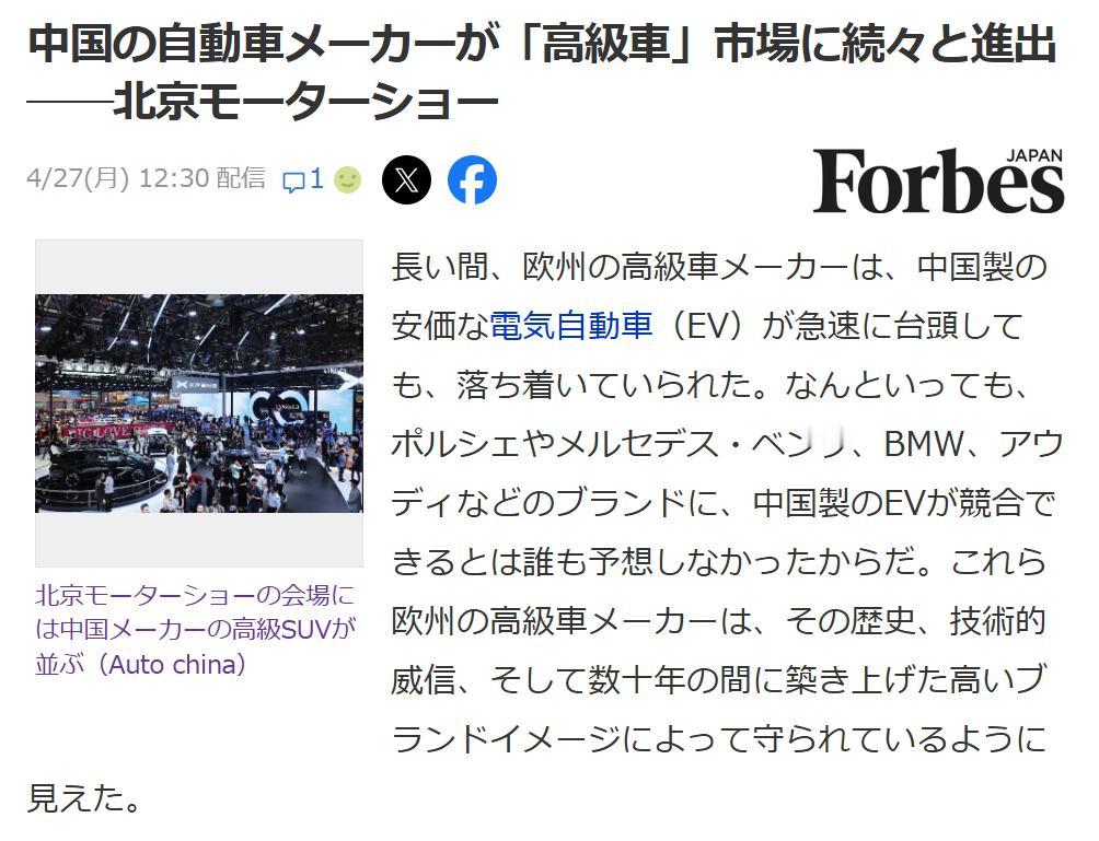 4月27日《Forbes Japan》刊文,从北京车展看中国汽车摆脱“廉价”标签进入豪华车领域。