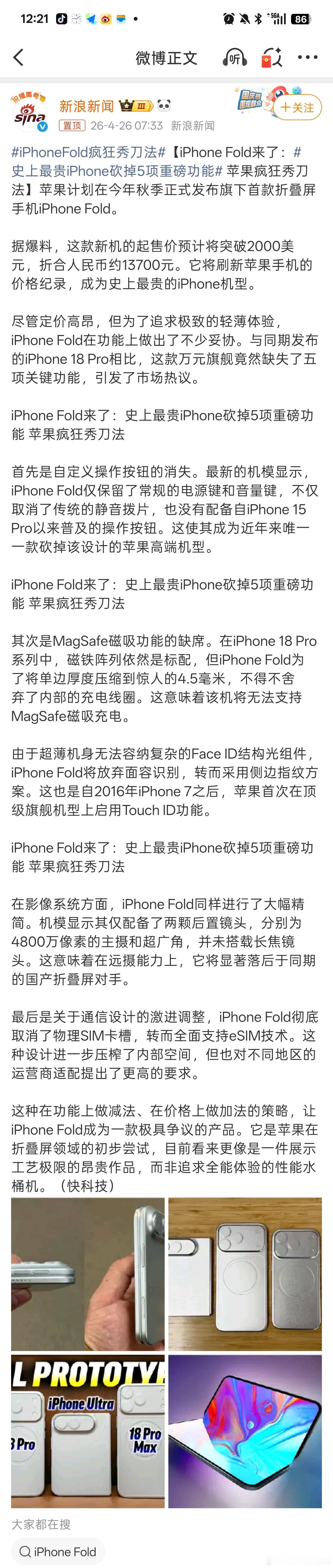 iPhoneFold疯狂秀刀法 折叠手机本来就是内部工艺很复杂,考虑到做工散热,配置一定比不上直板机,就看苹果对这套折叠的交互做的怎么样了,我很看中生态,说回来哪怕iPhone配置也不高,但是仍然得卖爆,这就是Only Apple Can苹果折叠屏