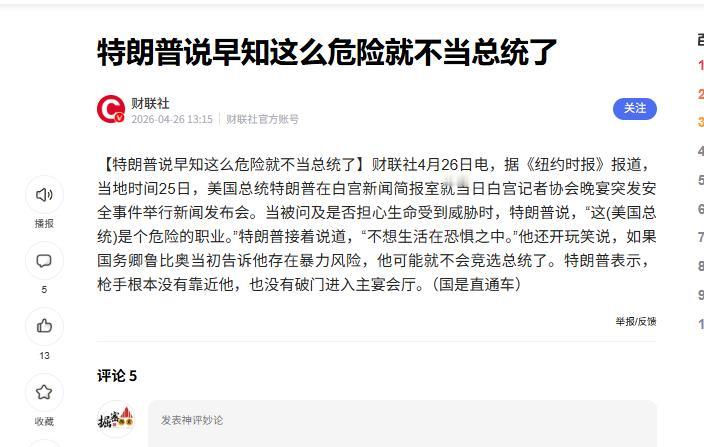 4月26日,特朗普在新闻发布会上突然说了句大实话:早知道当总统这么危险,我就不选了!