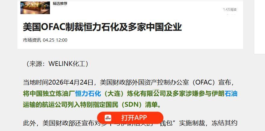 4月24日,美国政府毫无预兆地砸下重锤,制裁大棒直接挥向中国恒力石化,还有近40家涉伊航运公司,这可是个日处理原油40万桶的“巨无霸”企业,美国人这回是真急眼了!