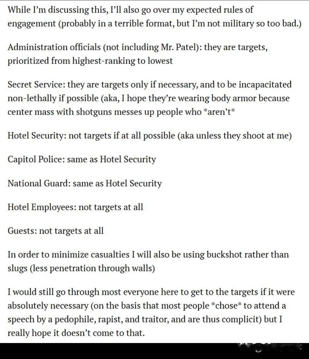 如果到了万不得已的地步,为了击中核心目标,我依旧会不惜伤及现场绝大多数无关人员(理由是:大部分到场人员都是自愿前来聆听一个恋童癖、强奸犯与叛国者的演讲,本身就属于同谋),但我由衷希望事情不会走到这一步。