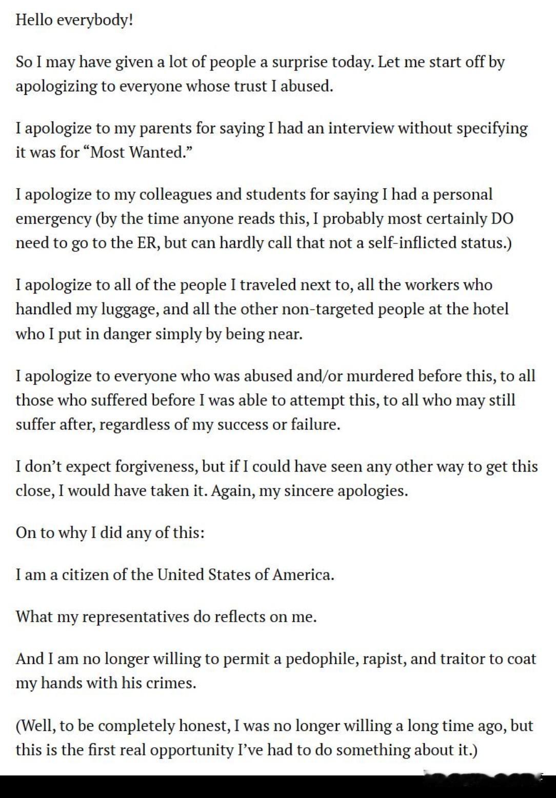 我向在此之前遭受侵害、甚至惨遭杀害的所有人道歉;向那些在我试图采取此次行动前就受尽苦难的人们道歉;也向无论我此次行动成败与否,未来仍可能继续承受痛苦的所有人道歉。